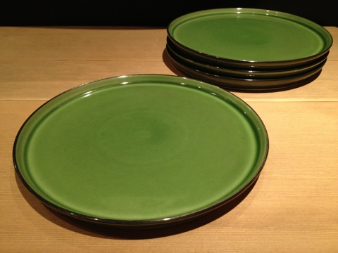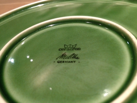 個人的には今回ご紹介する中では一番気になったのがこちら。ドイツのメリタ/ Melitta のφ19センチプレート。珈琲関連が定番ですが、80年代まではこんな素敵な食器も作っていた様です。薄い縁部と綺麗なオリーブグリーンがスタイリッシュ。sold