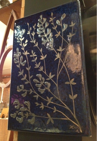 Gustavsburg グスタフスベリの銀彩の陶板。60~70年代、花と地域シリーズの”Halland Harginst” です。深いブルーに繊細な銀彩が優美です。若干シルバーが薄めになってきています。