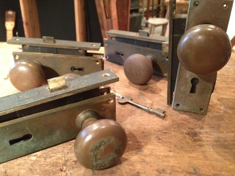 まず昭和30年代真鍮ドアノブのセット、四セット有ります。鍵は一つだけあり、二セットのみ施錠可能です。枠側の受け金具はすみませんございません。