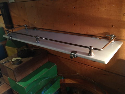 意外と探されてる方の多い、白いミルクガラスの小棚。壁へ直接ビス留めします。一箇所小さくチップしております。w/460ミリ d/125 sold