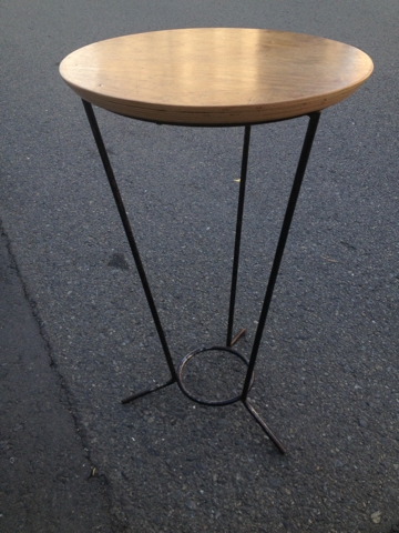 1960年代の傘立てをベースにラウンド天板のサイドテーブルに仕立ててみました。良い感じの丸板が見当たらなかったので、古い学校の机天板(楢の合板)から切り出し、軽快にする為エッジにテーパーを付けました。アイアンフレーム、天板共に経年の傷などを活かしワックスにて保護。ソファ横などにちょこっといかがでしょう。