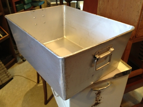 給食で使われていたアルミバケット、テーパー感と使用感がイケております。ちょっとした収納などに活躍してくれそうです。
