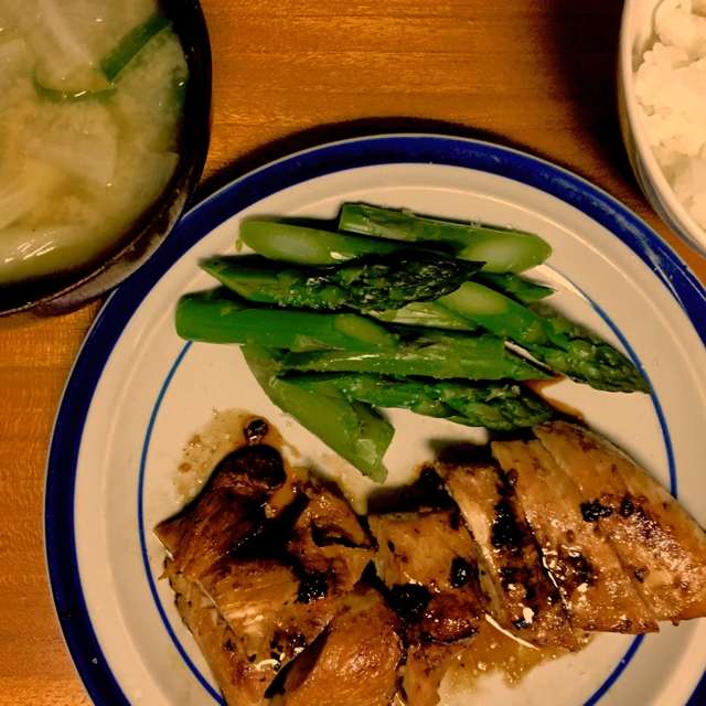 昨夜の自宅定食。戴いた北海道産アスパラガスメインで、解凍しちゃって塩麹漬けにしていた鶏むね肉を焼き大根とネギの味噌汁を。新鮮なアスパラは塩だけでも美味いですなぁ、Kさんご馳走さまでしたー。