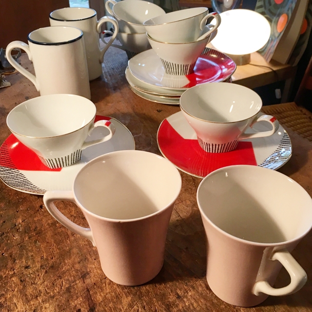 朱色が鮮烈です、ノリタケの60年代辺りでしょうか、ちょっとフィフティーズぽいアブストラクトな柄のC&Sセット。