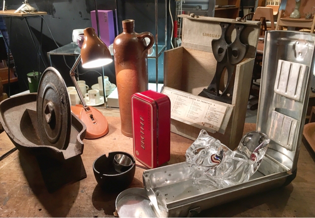 70年代国産12V球使用のミニライト明暗二段階。3.500- ヨーロッパの古い陶瓶下部にちょっと欠けあり水漏れは無し。3.000- ブラザーの赤いミシン缶。1.500- 南部鉄器の丸い灰皿1.500- に乗るのはWMFのコーヒーメジャー 800- 渋い英国製イングリッシュ学習レコードセットのEPケース少々難ありで1.000- 中は馬場さん作南部鉄器ブックエンド’マスク’ひとつのみ 3.000- アルミのケースは鉄道の特殊信号携行函。閉めると楕円の筒状になる面白い構造。5.000- 乗船している隠れた定番ササキクリスタル動物シリーズのリス。