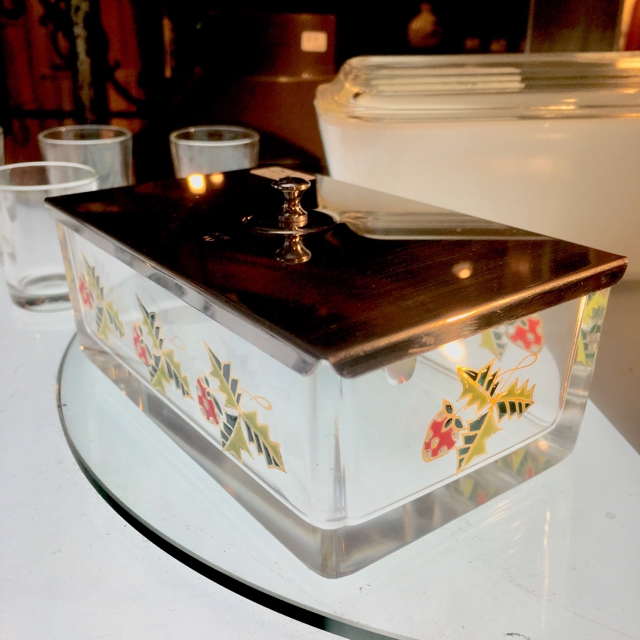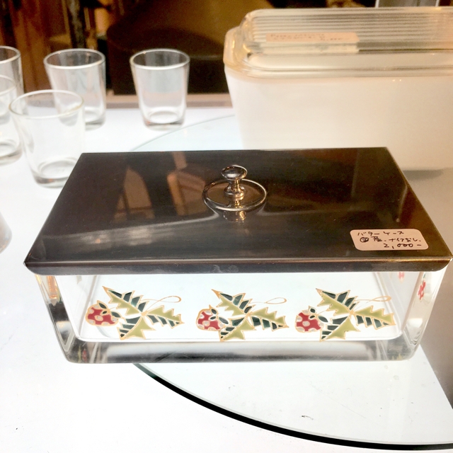 国産のちょっと古めな厚手ガラス製バターケース。イチゴが可愛らしくプリントされてます。蓋はステンレス、ナイフは無し。内寸 127×71× h/42ミリ sold