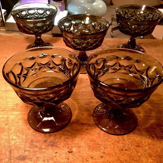 70年代頃でしょうか、ノリタケのヤングカラーというラインのコンポート或いはゴブレット。Φ103 h/103ミリ ずっしりと厚手でちょっとゴージャス。色はスモーキーなグレー、少々キズ有りの個体もございます。デザート用にいかがでしょう。5客有り 1客 1.000-