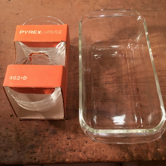 ヴィンテージパイレックスUSAメイド2種。大振りな品番213 Loaf Pan 外寸 w/255 d/125 h/75ミリ 勿論オーブンOK 使用感無いです。1.500-