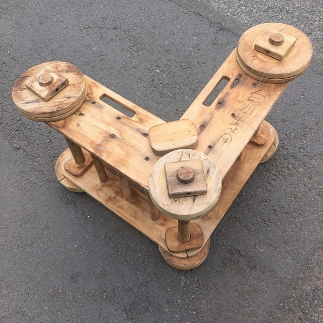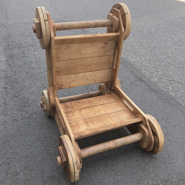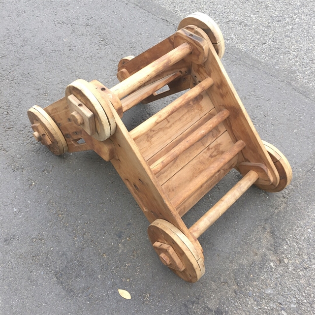 台車の様な謎の道具を仕入れてまいりました。ブナかナラ辺りの確りした無垢材のみで構成され、丁寧な仕事で車輪が6輪、直角の躯体に組み込まれています。白組専用 と読める書き込みがあり、動きはまあスムーズに回ります。そこそこ重量のあるものを運ぶ物までは分かるのですが、対象が不明ですね。