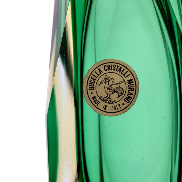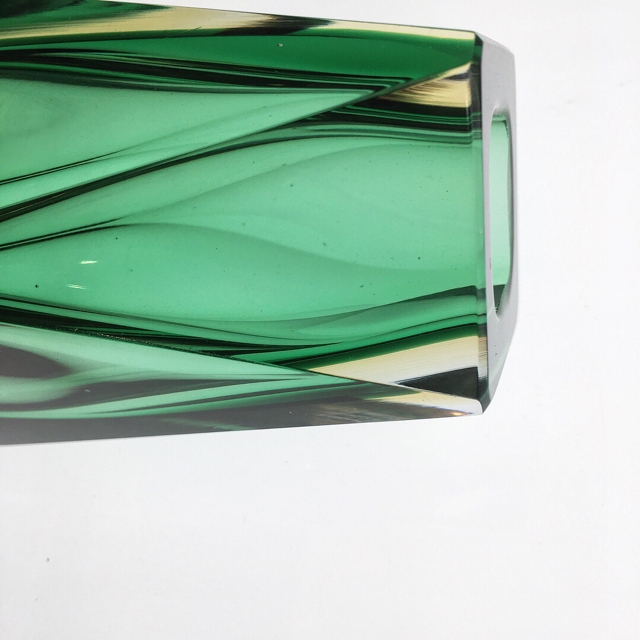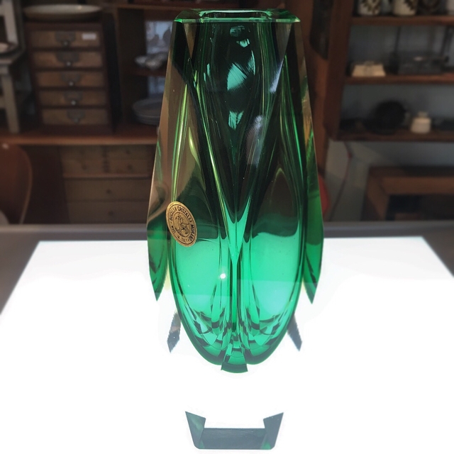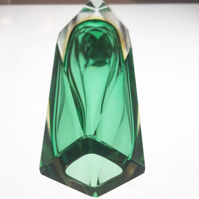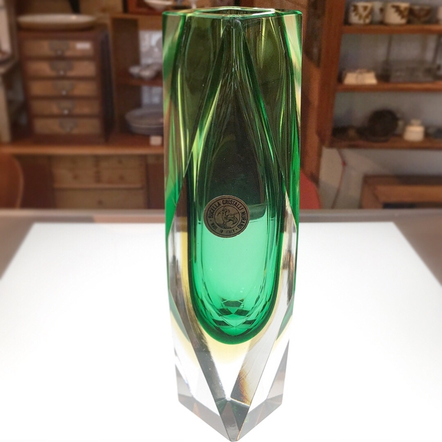 去年入荷したモデルはパープル基調でしたが、今回は涼しげなグリーン、イタリア ムラーノのカットガラス花器が入りました。