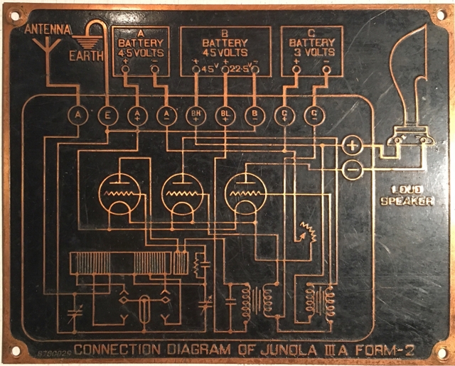 全く関係ないのですが、古い木箱に留められていたラジオ音響機器の回路図らしき真鍮製エッチング銘板です。額装したらカッコいいかなと思ったり。