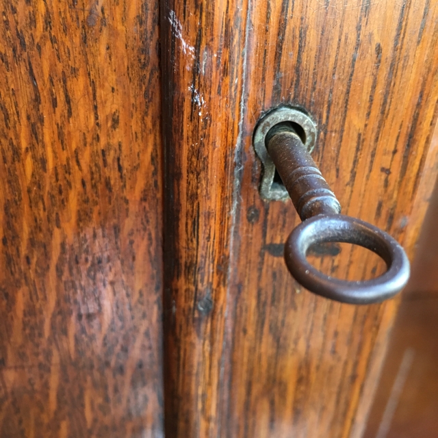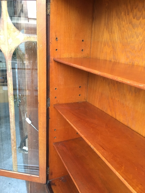 棚板は3枚ダボ金具は真鍮製のオリジナルと思われる物が揃っています。開閉は右扉は鍵にて、左は裏側の留め具にて行います。
