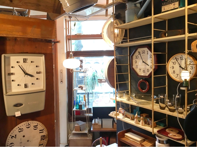 カウンターから入り口方面の眺め。左、ナショナルのモダンなグレーの掛け時計はクォーツ置換改造完了し、お迎え待ちスタンバイ中。実は未着手の同モデルがもう一台ございます、気になられた方改造のご依頼お待ちしております。
