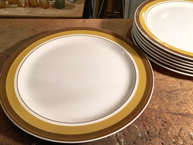 今夜は満月との事、洒落た配色のヴィンテージプレートをご紹介。国産70年代のTOPAZとのスタンプもイケてます。少々のカトラリー跡は有りますが比較的綺麗な状態で、オーブンなどもオッケーな大振り2サイズです。Φ310が1枚 sold Φ270ミリが 6枚 sold 勿論セール対象でございます。