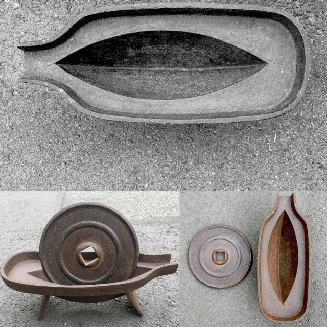 こちらは鉄の鋳物製でどっしり重いです。サビは全体的にございます、残念ながら円盤真ん中の握り手は欠品しています。