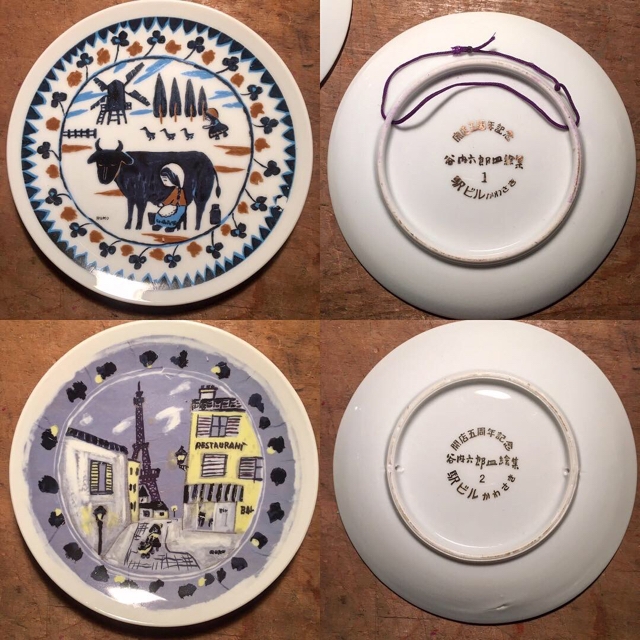 昭和な方々にはお馴染みのCM「週刊新潮は明日発売されます。」が懐かしい、創刊号より表紙を描かれていた谷内六郎氏の絵皿二枚です。裏へ金スタンプで 駅ビルかわさき 5周年記念 谷内六郎皿絵集 とあり、オープンが1958年とのこと、1963年の物の様ですね。