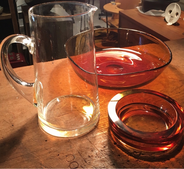 硝子が続きます、アンバーガラスふたつとクリアガラスの大振りな水差し。