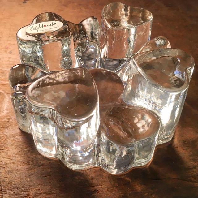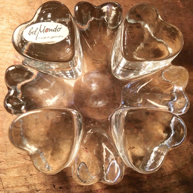 引き合いの多かった、ドイツはbel Mondo のガラス製のどっしりしたポットウォーマー。こちらはφ140ミリの小さいモデルで、お初のちょっと甘めなモチーフはハート或いは四つ葉のクローバー。