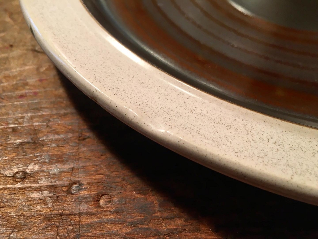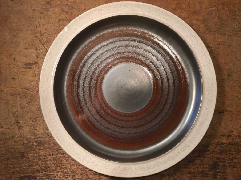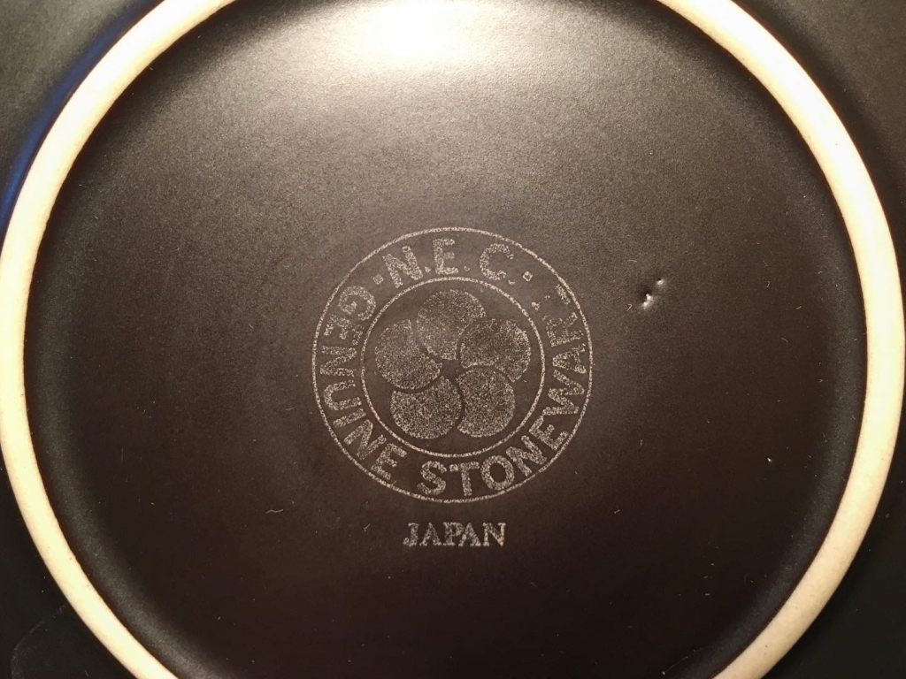 恐らく70’sのプレート、N.E.C ストーンウェアJapanとあります。マットなチャコールグレー& 赤茶の輪はグロス、縁のベージュと洒落た配色です。