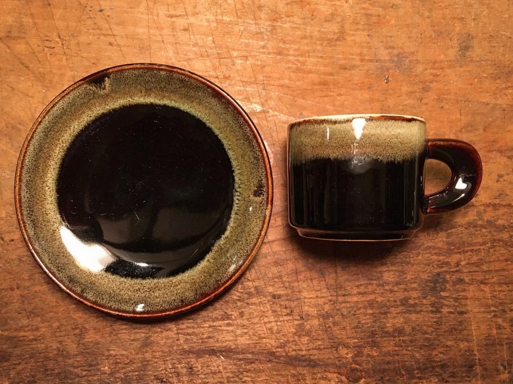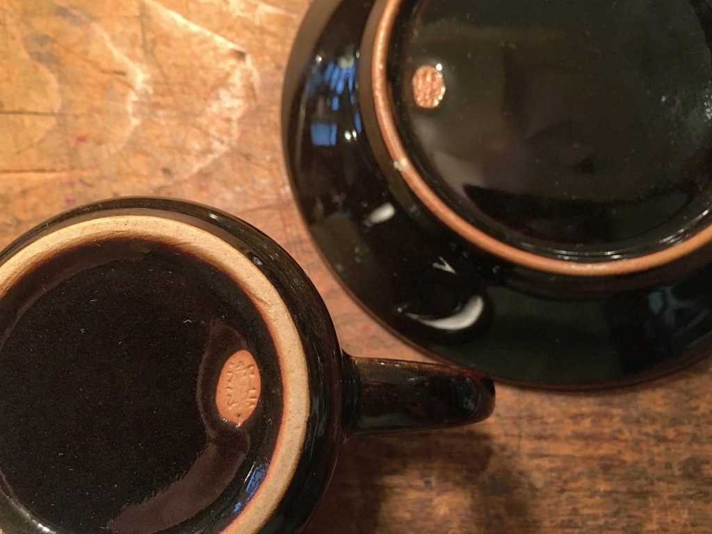 御浜(みはま)と刻あります、三重県の今はもう無いとの御浜窯珈琲カップ&ソーサーです。こちらは全体に艶があり落ち着いた佇まいです。ソーサーにはカップの納まる窪みが有りませんので、単体使用もOK。使用品なのか薄いスレ傷が少々ございます。