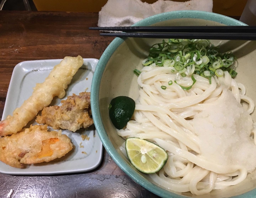 帰り際に小腹が空いたので一度行きたいと思っていました初おにやんま 0時までやってました。23時頃でしたが外で待ちが出来るほどの繁盛ぶり。暫く待ち提供された冷やし おろし 天ぷら盛り 醤油だったか 620-です。