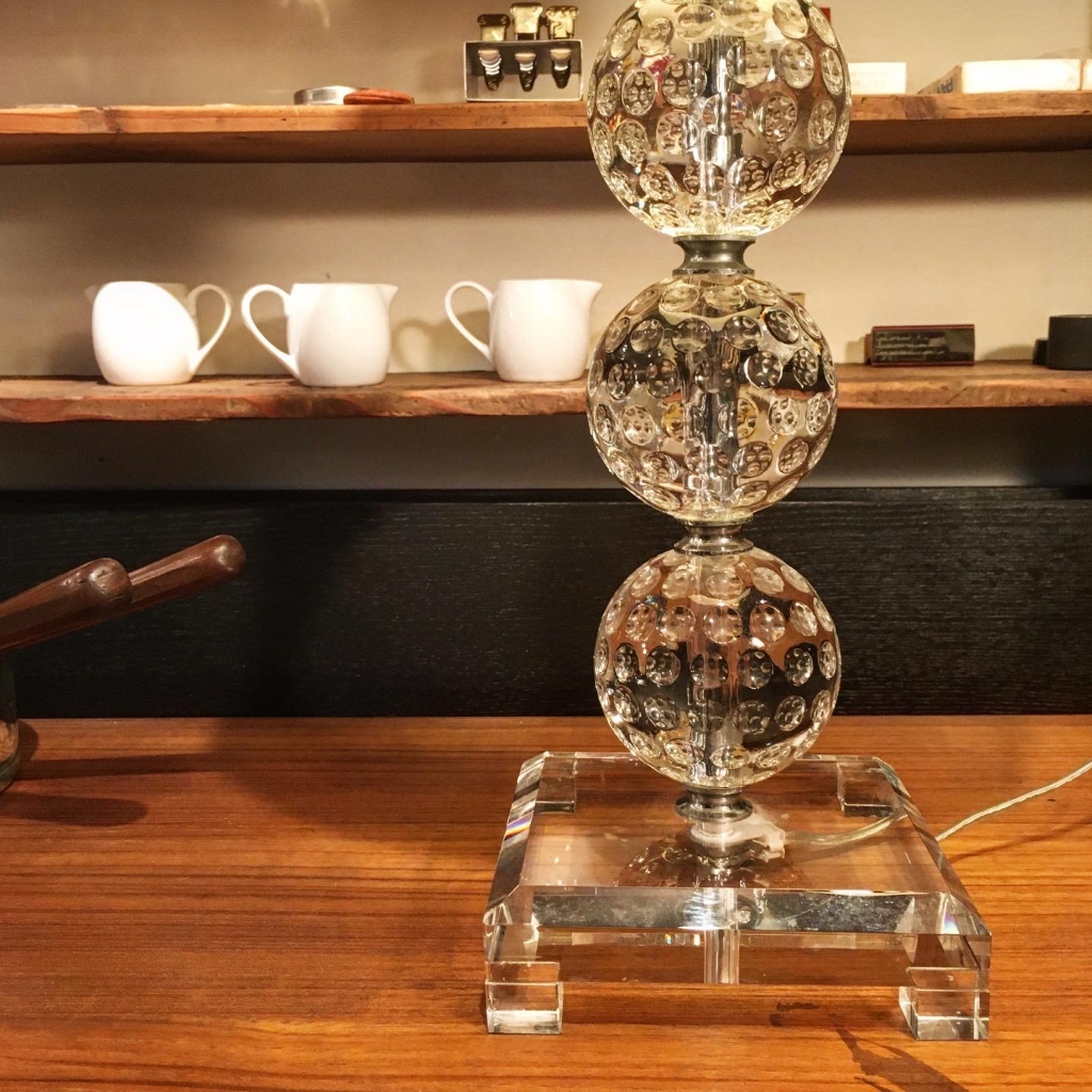 シェード部はそれなりな使用感が有り、内側の樹脂板に数カ所ヒビがあります。現状、割れ落ちや布破れ等の目立つダメージは無いかと思います。ベースのガラス部もチップなどダメージは見当たらず綺麗なコンディションです。全体の高さ 295 シェード径 300ミリ sold