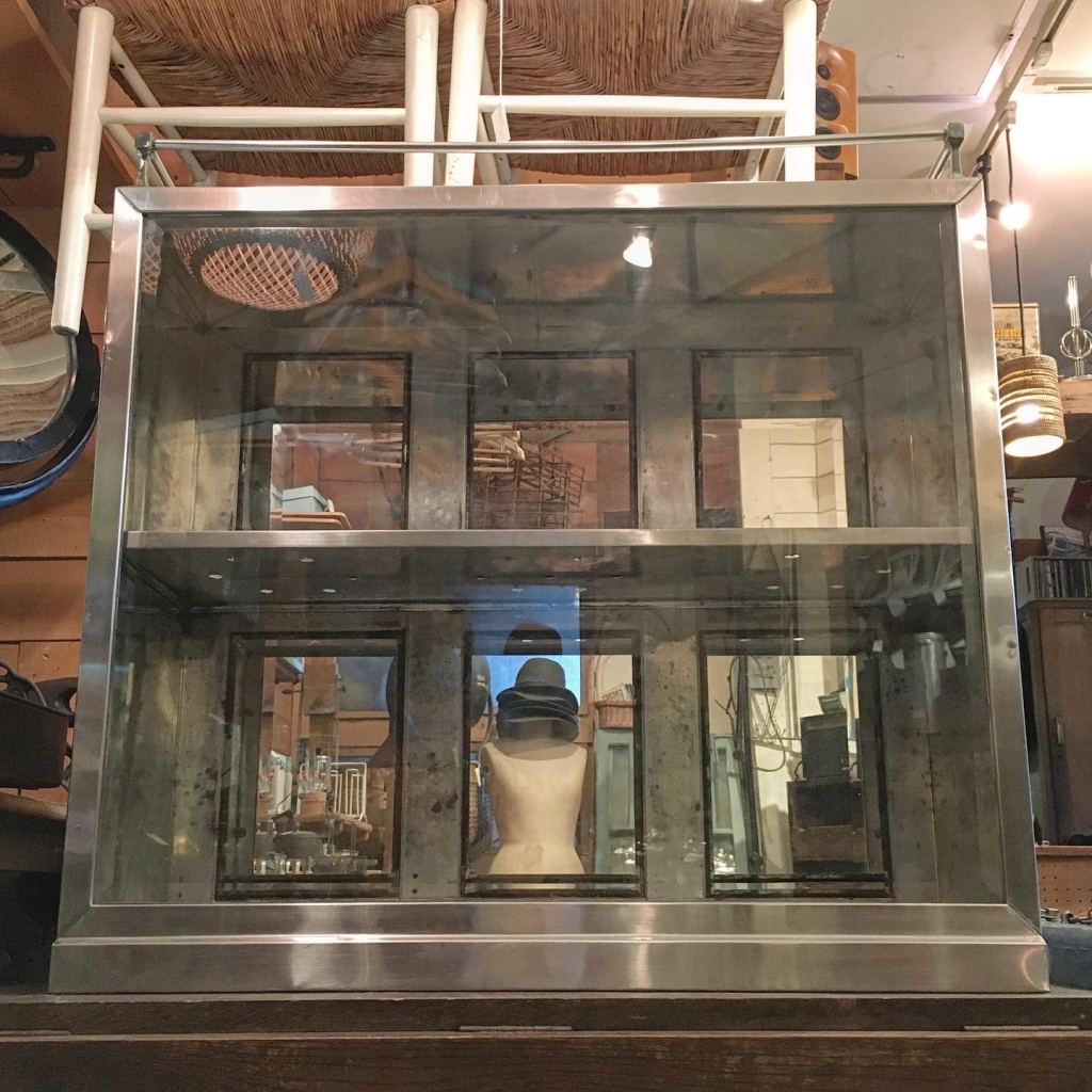 海苔や鰹節などの乾物を陳列販売していた硝子ショーケースです。裏から6つの扉を開閉出来扉の裏側へは鏡が装着されています。