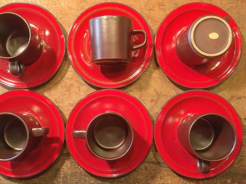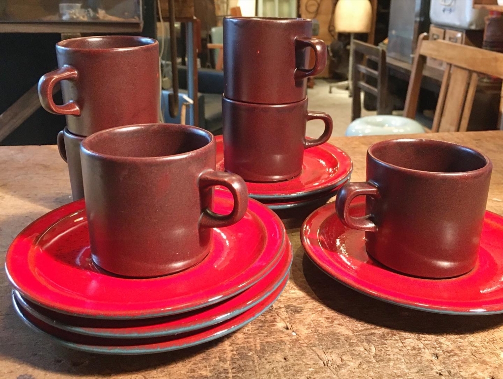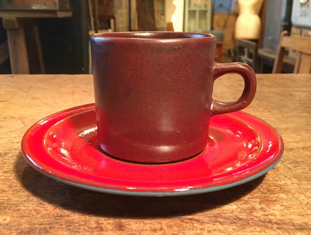 ソーサーの赤が鮮烈、ドイツ製ヴィンテージ花器なんかでも時々見られる独特な赤ですね。
