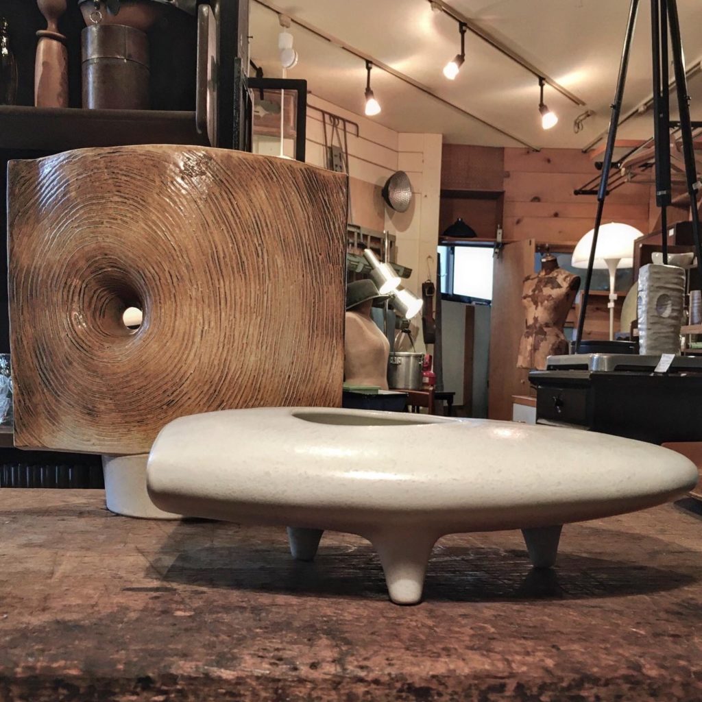 好対照な雰囲気で抽象彫刻の様な花器がふたつ。