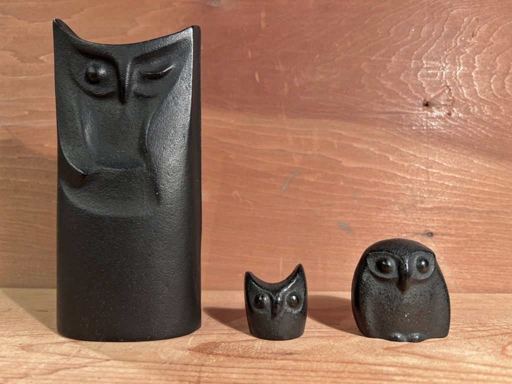 昨日の鉄塔仕入れより。永井鐡太郎氏による南部鉄器のフクロウ三品。左の大きめな作品は呼び鈴仕立て、音圧高めです。どちらも恐らく1980年代初頭頃の作品。