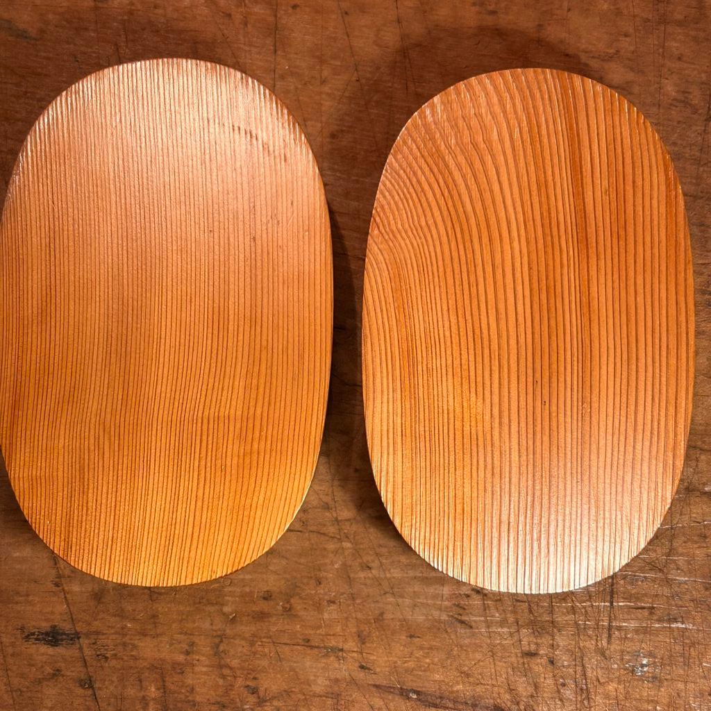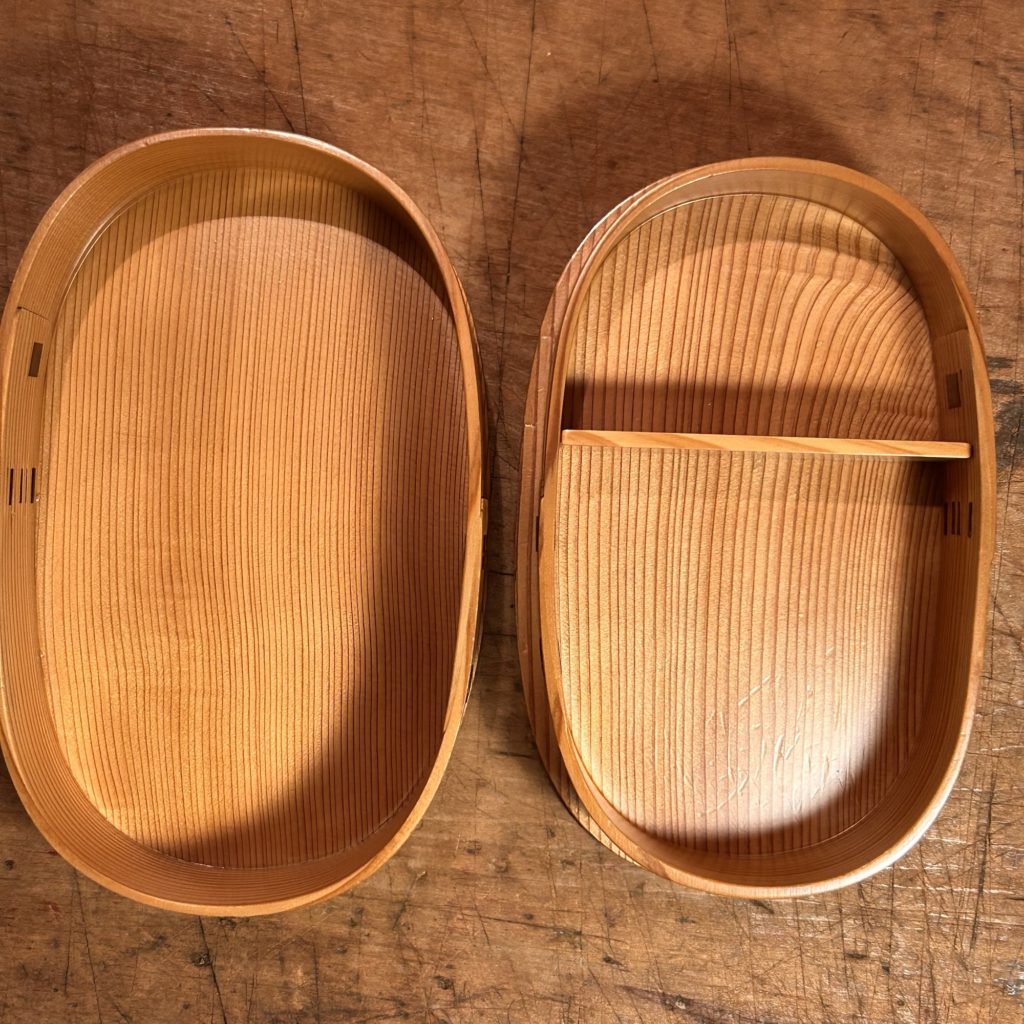 この暑さで弁当箱?と言われてしまいそうですが、大館工芸社 秋田杉の曲げわっぱ小判弁当箱、年代的にはそこそこ経っていそうな使用品です。内外共に少々使用感はありますが、衛生的には気にならない程度ではないかと。w/130 d/205 h/60ミリ sold