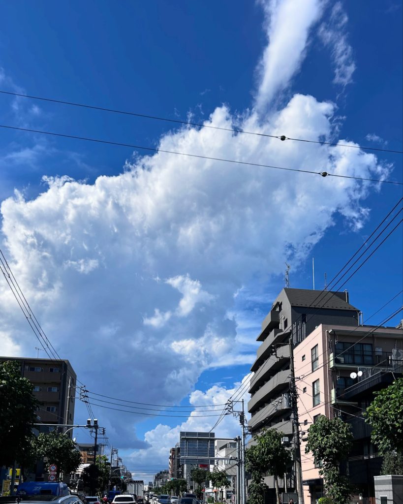 大渋滞中に立派な入道雲。その先には初心者マークを付けた軽ワゴンが軽く自爆しておりました。どうぞ皆さまにおかれましてはご安全に。