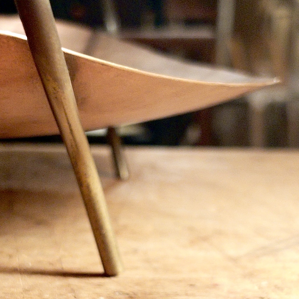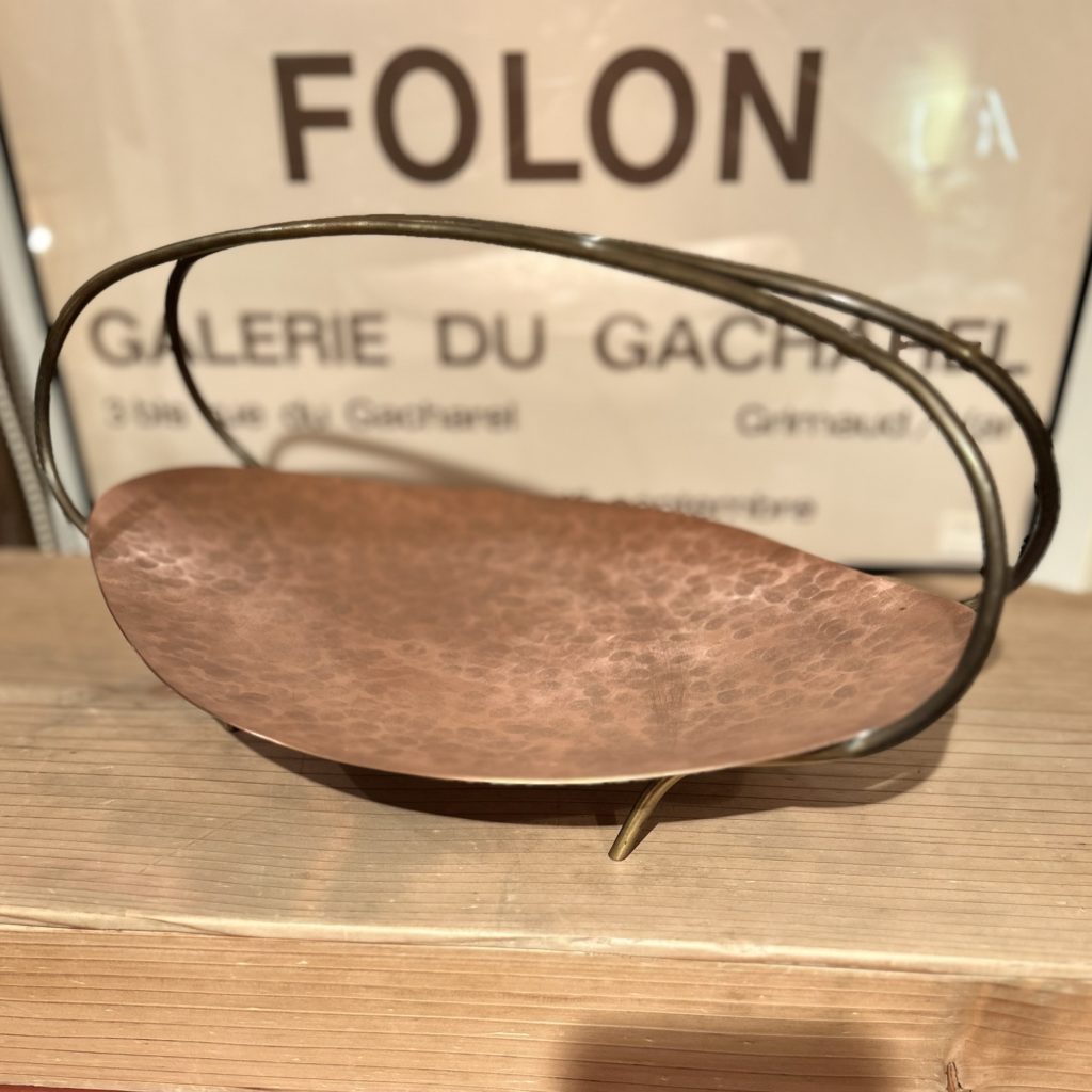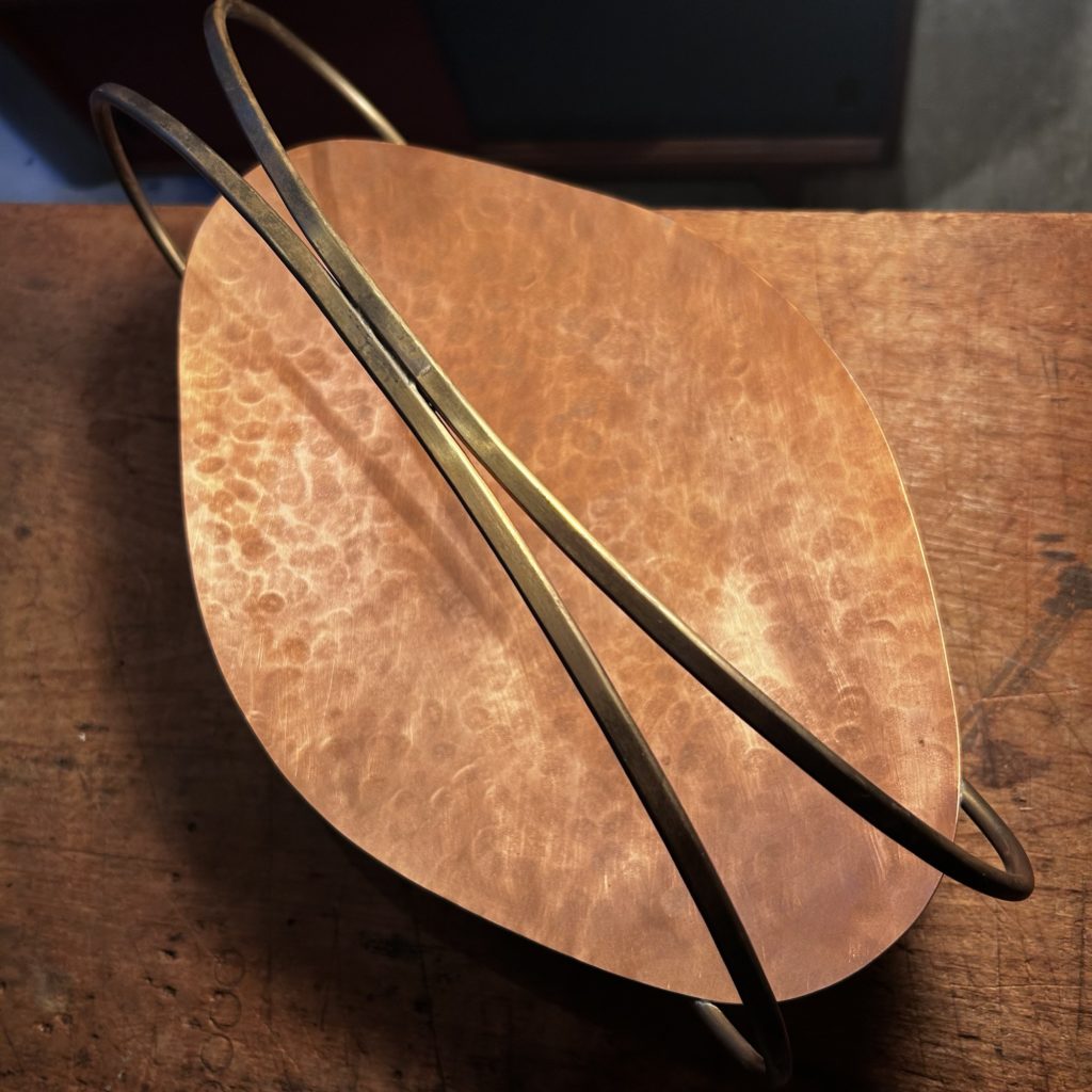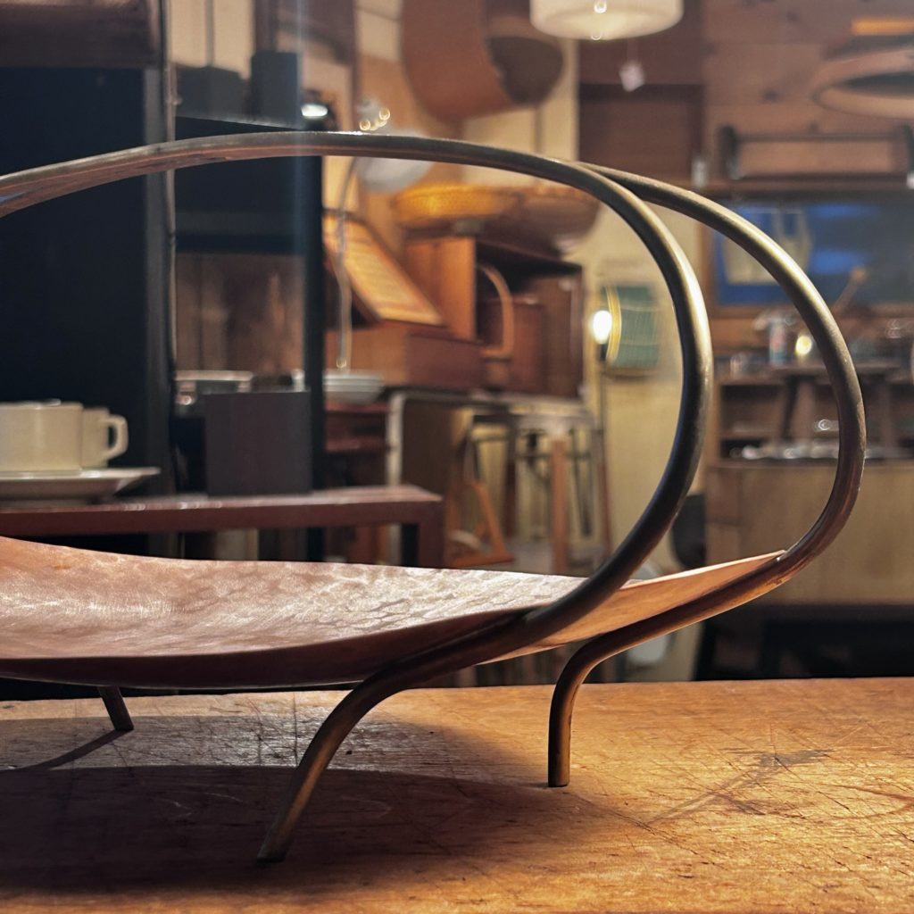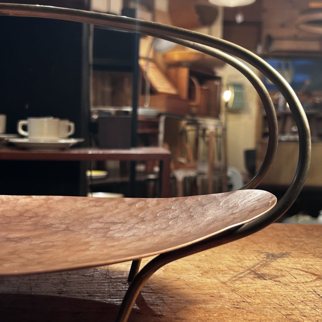 銅×真鍮のトレー /コンポート。詳細は不明ですが叩いて叩いて造った作家物と思われます。有機的でありながらモダンさも感じる架空の生き物の様な不思議な魅力を放っております。銅 真鍮部共に表面処理はされておらず素の状態です。