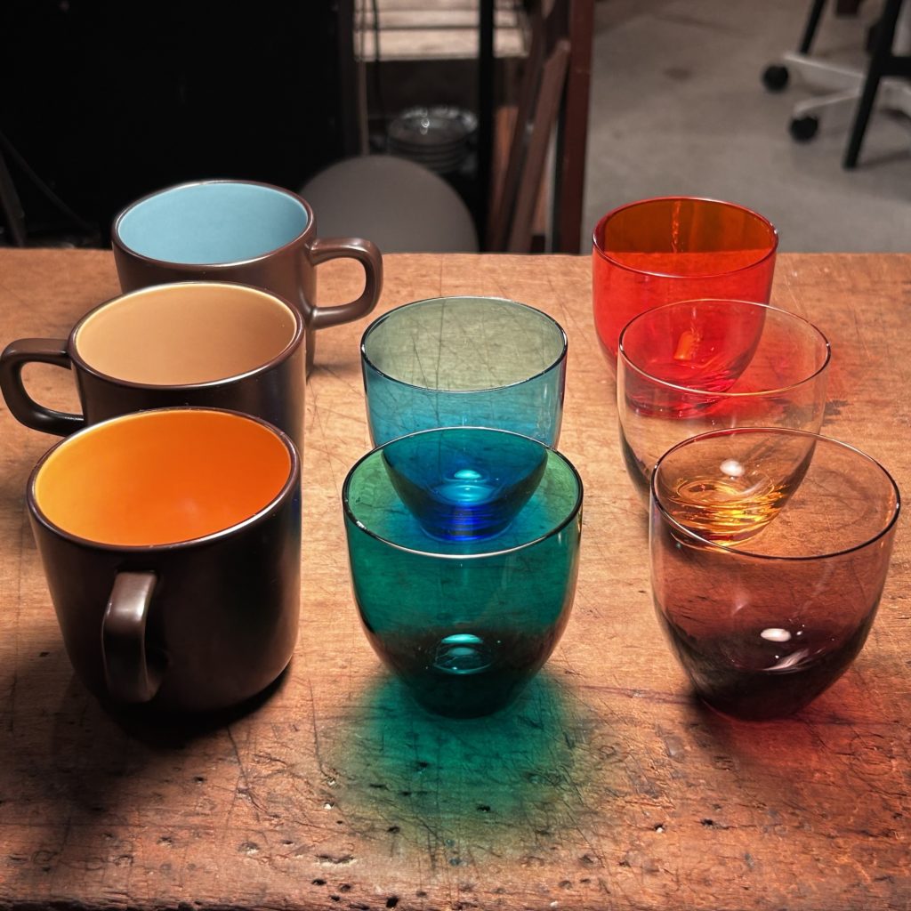 カラフルなマグとグラスを併せてどうぞ。