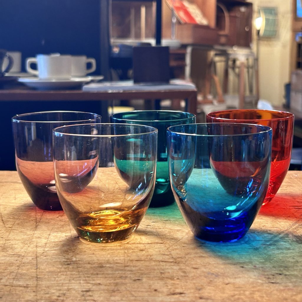 定番のカラーグラス5Pセット、こちらは5つセットで宜しくお願い致します。ボトムがシュッとシャープなシェイプです。径 70 高 75 ミリ