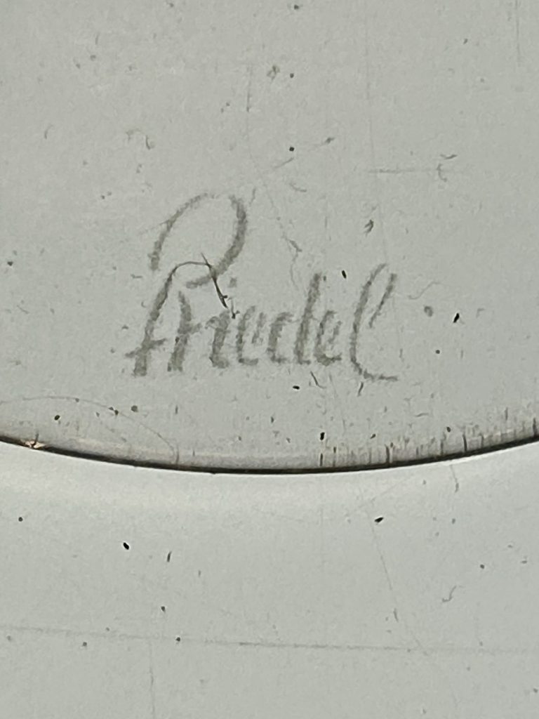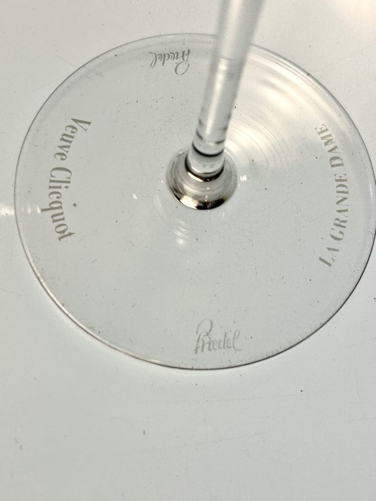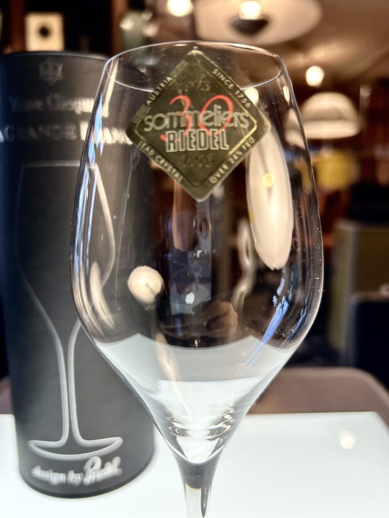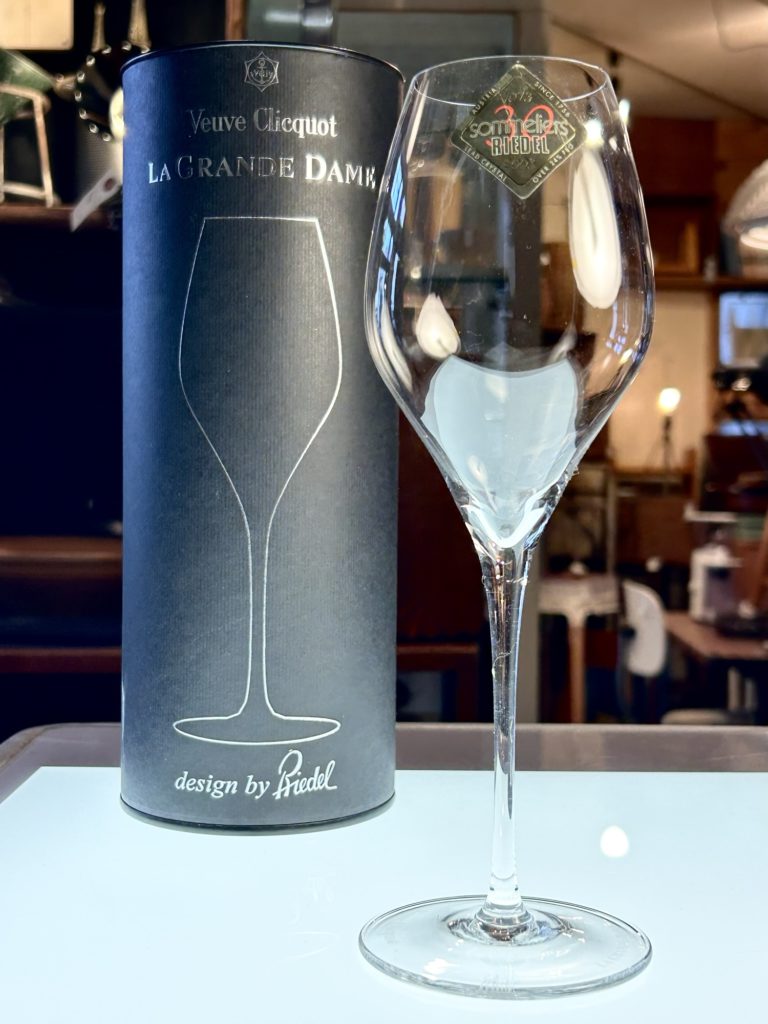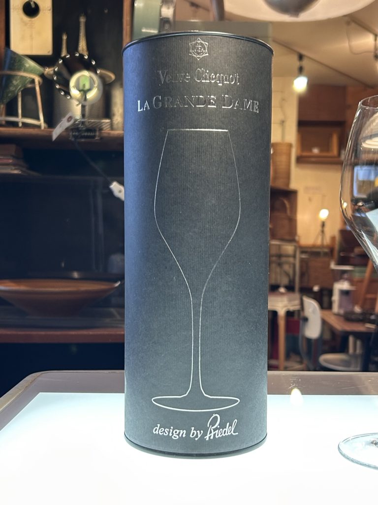 リーデル ソムリエシリーズ30周年記念に造られたと思われる、仏の高級シャンパン Veuve Clicquot La GRANDE DAME の名を冠したシャンパングラス。未使用デッドストックで出てきていますが、一度洗浄しています。その際剥がれたデカールを再びテープで留めた物もあります。デカールへ2003年と有りますのでざっと20年以上前からのお品物になります。黒い筒型のケースにひとつづつ入っています。クリスタル製 で、リーデルのロゴは筆記体ですので手造り品という事になります。 元箱に400/85のナンバリング有り。高 230 口径 50ミリ sold out
