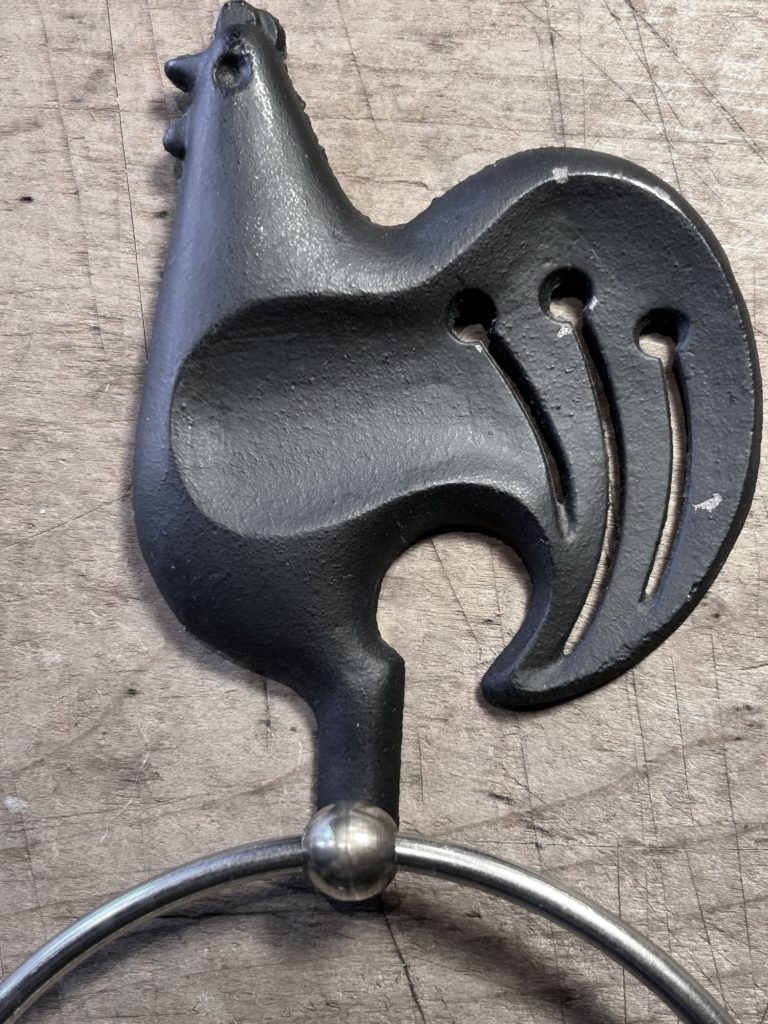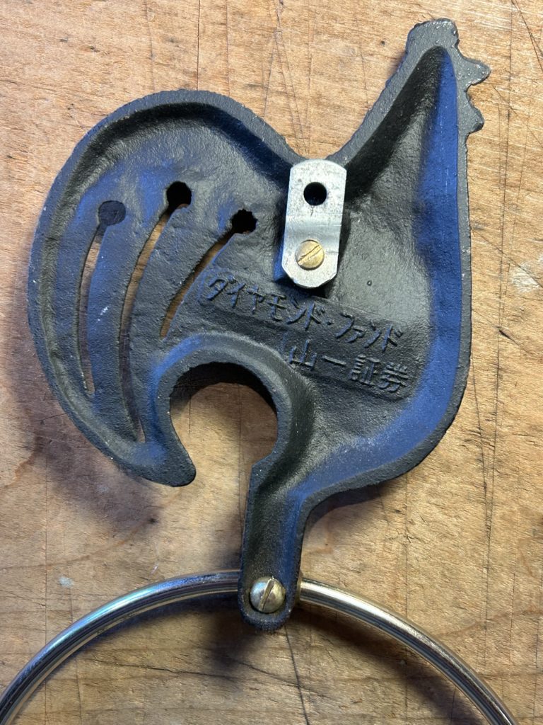 鋳鉄製ニワトリモチーフのタオルハンガー。60〜70’sの国産、馬場忠寛氏臭が香りますが不明です。裏へ山一云々と型抜きからの記念クレジットが入っております。また、本体を留める金具が欠落しておりましたので当方にて簡素な物を付けました。ドアノッカー的な飾り方も良いですね。ニワトリ部は鋳鉄へ艶消し黒塗装、何箇所かピンポイントで当たり剥げが有ります。リング周りは真鍮製です。高 250 リング径 135ミリ sold