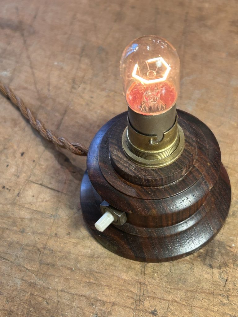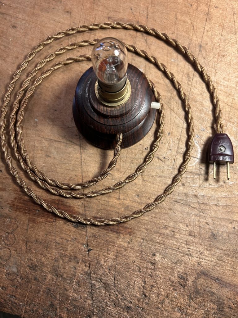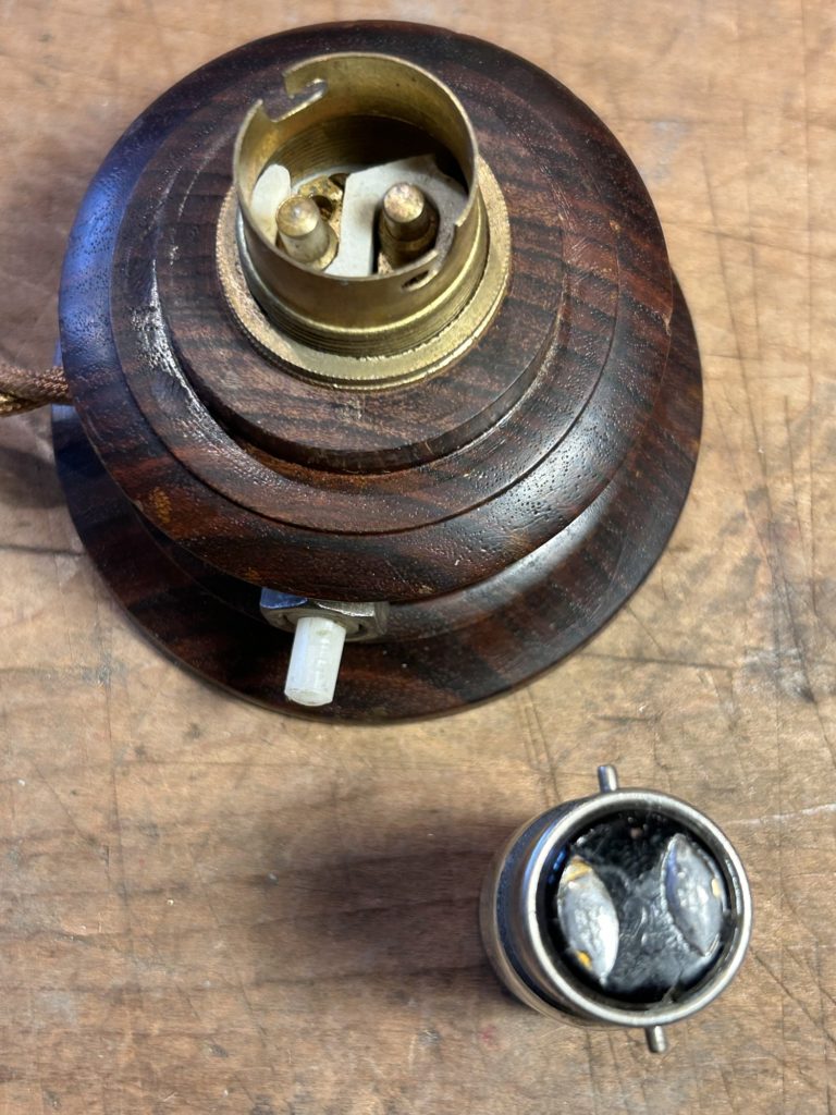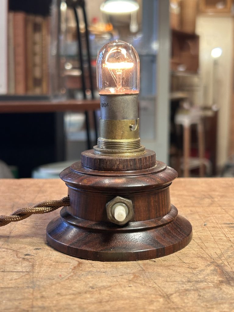 先日ストーリーズではチラ見頂きましたヨーロッパ球の小型ランプのご紹介です。新品の薄茶色捻りコードへ繋げ直しまして、押しスイッチ取り付けナットを鉄製へ変えましたが真鍮の合うものが見つかり次第交換予定です。内部配線は繋ぎ直し、コンセントは合いそうな古手の物を選びました。