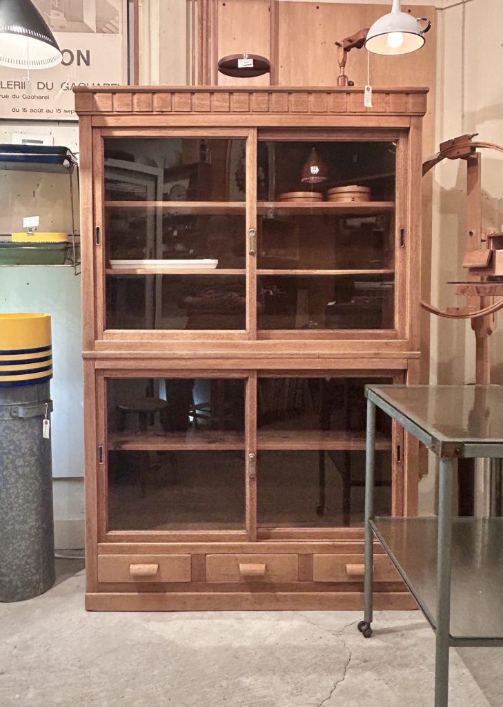 追って改めてご紹介しますが、こんな感じの大振りな二段重ねのガラス戸棚も加わりました。如何でしょう。w/1.110 d/350 h/1.65ミリ sold