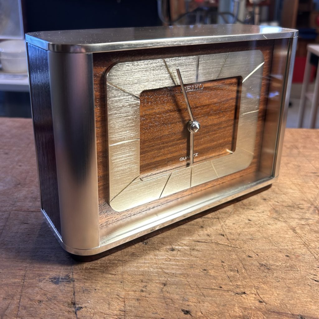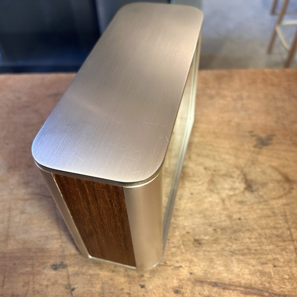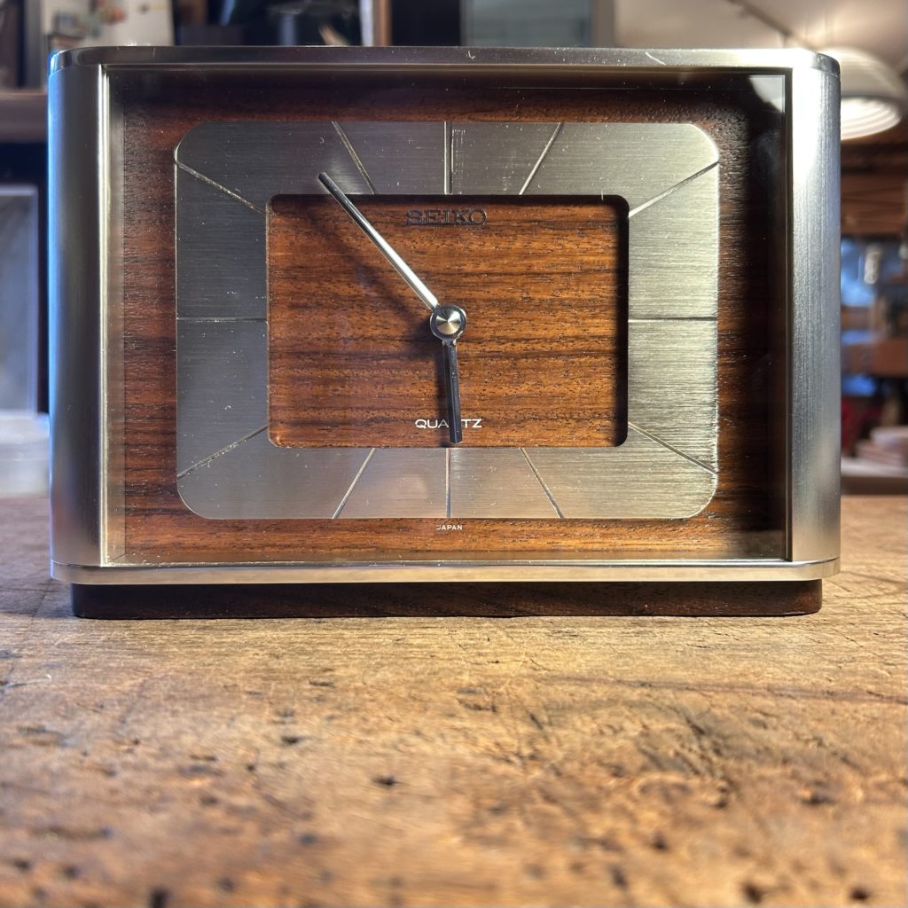 程よい高級感と80’s書斎感。如何でしょうこの感じ。シャンパンゴールドぽく見えなくも無いですが、色味無しのアルミシルバーです。アラームも秒針も無くただただ時間を指すのみ。単二電池使用も時代を感じます。w/220 d/87 h/150ミリ sold