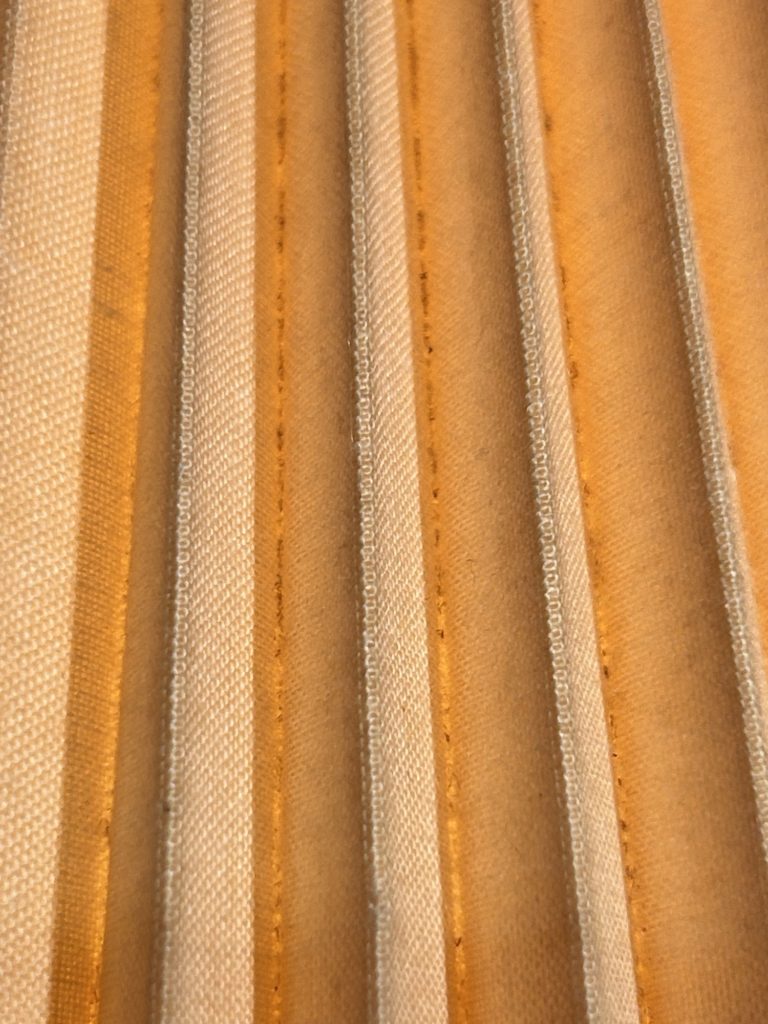 シェードは樹脂板を折り曲げた物へ粗い繊維を張ったもの、焼けや変質ございますが割れや目立った損傷は見当たらず、総じてベース部との相性は良いと思います。随分掃除しましたが折り目の谷部に取りきれなかった汚れが少々残ります。