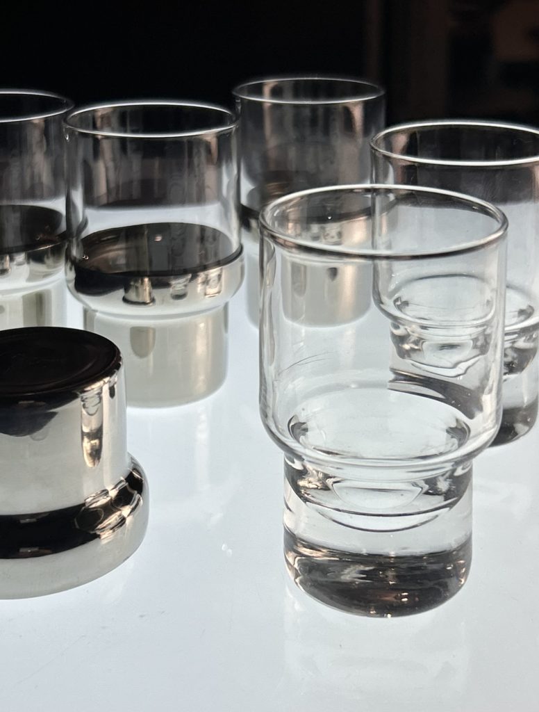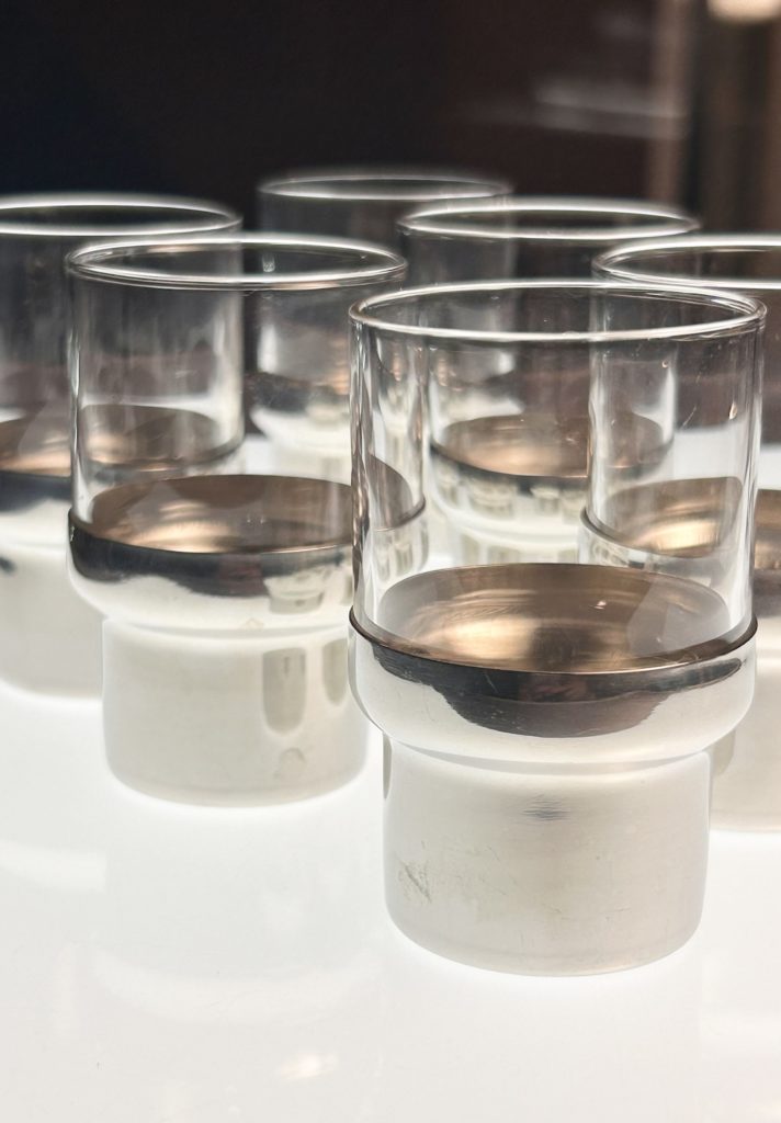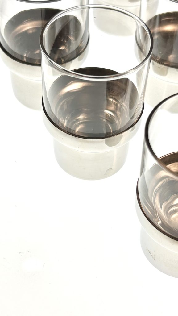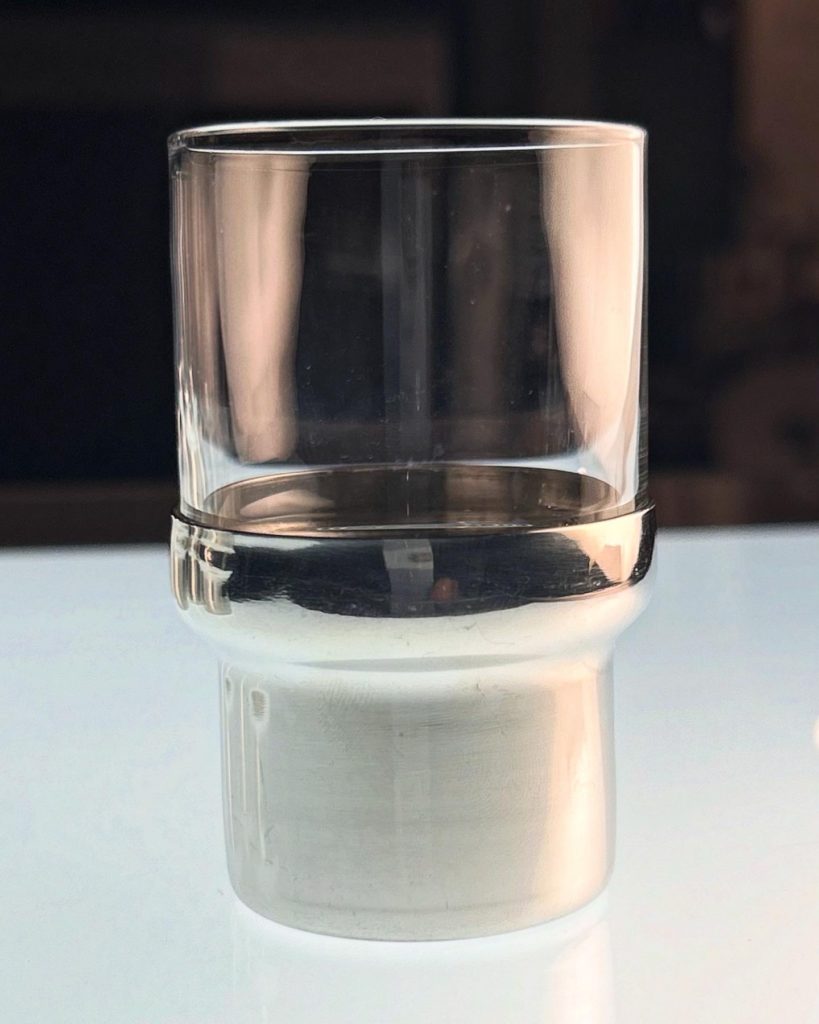 inoxpran ステンレスに定評がある様です。こちらは60’s後半から70’s辺りのショットグラスというには大きめなグラス。ボトムにステンレスのカヴァーが嵌る洒落た造りで、濃いいエスプレッソを頂くのも有りかも。ガラスに個体差があり緩い相性もあるのでご注意。カヴァーを外して使っても良いと思います。容量 フルで90ml程 径 46 高 76 在庫 1 1.500-(税込) 配送 60サイズ