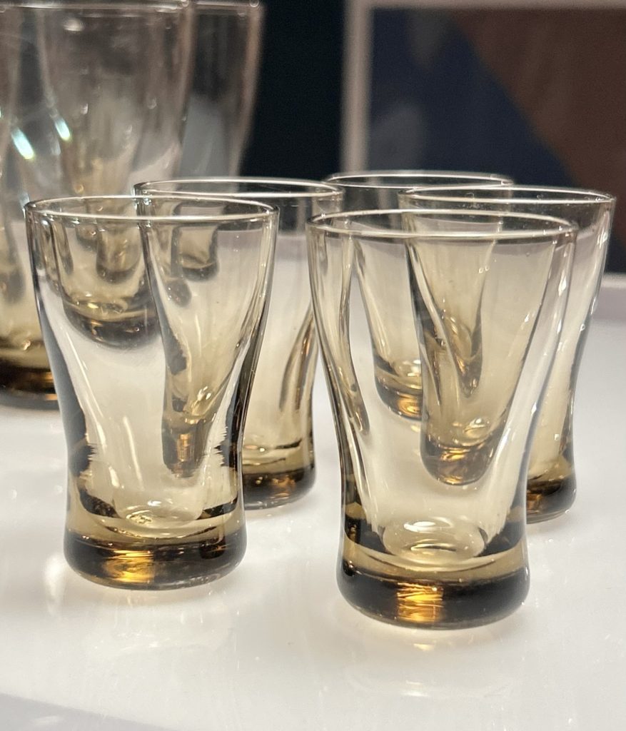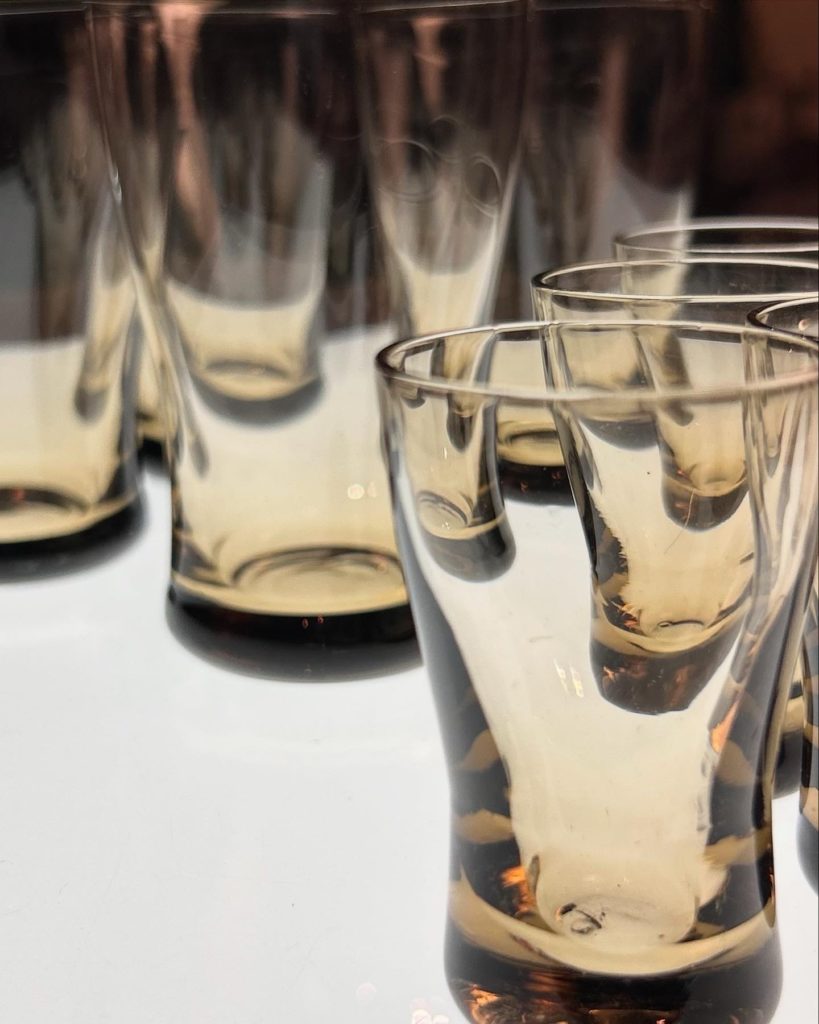 飴色の様なちょっと珍しい色味です。ビールが美味そうなグラスとショットグラスが同デザイン、恐らく国産60年代辺りからの未使用品です。ショットグラスでこの感じのフォルムはちょっと珍しく、転び易そうですがボトムがぽってり肉厚で意外と大丈夫そうです。