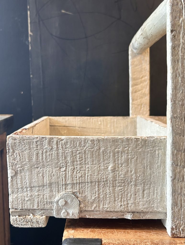 古い持手つきのシャビーな木箱。塗り足され長年使われてきたストーリーが垣間見られる様な恐らく海外製。構造的には意外と確りとしております。