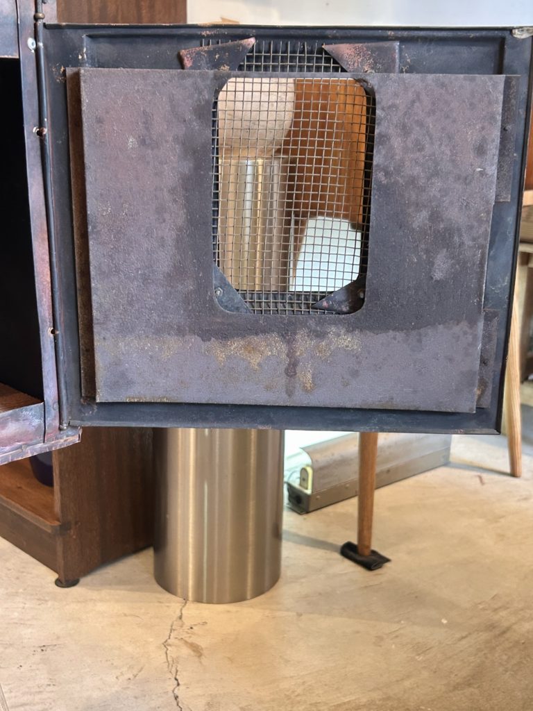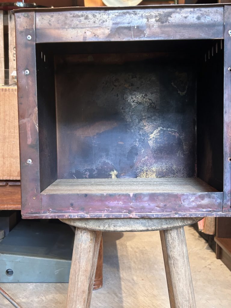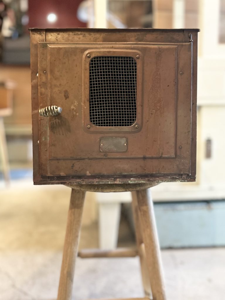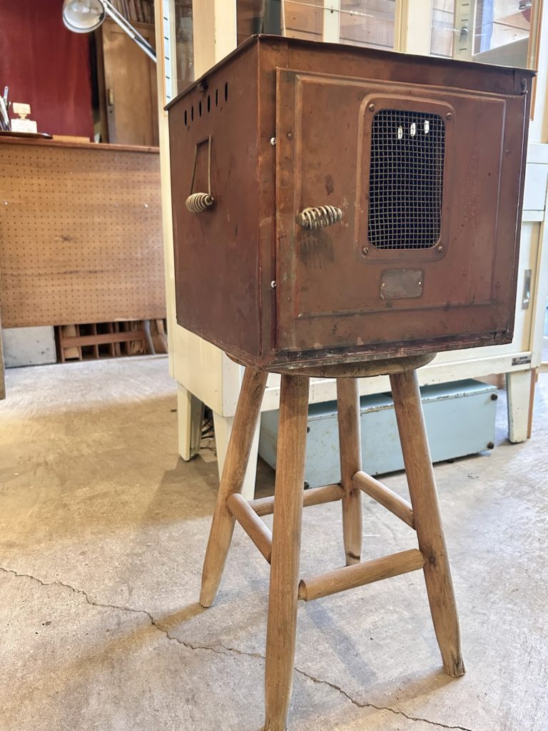 銅製の天火(改)。天火とはかつてあったガスコンロの上へ載せコンロの火力を利用して使うオーブン。葫蘆の物は時々見かけましたが、銅製の物は初めて見ました。だいぶ古そうです。本来は穴が空き放射板状の構成物がある底部を板へと付け替えられています。ストッカーや収納など用への転用にどうぞ。因みにLPレコードは入りません。内部は焼けや焦げの痕跡が残ります。古く緩い造りで扉の閉まりも甘めでございます。下の脚部は撮影用に使った丸椅子(難あり 7.000-)で別売りです。w/325 d/325 h/295 sold