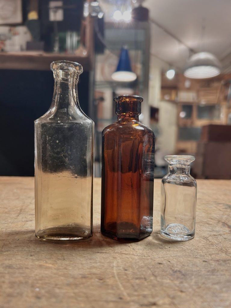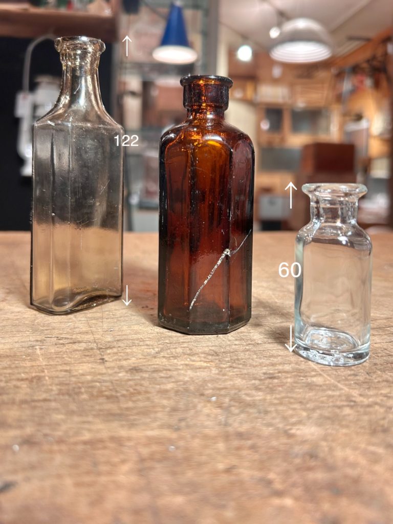 小柄でクラシカルな欧州ぽいガラス瓶が流れ着きました。左 うすーいグリーンの瓶は仄かに銀化してきている様に見え、とても良い気配を放っております。口縁脇に欠けが有りました。高さ 122ミリ程 2.000-(税込)配送 宅急便コンパクト