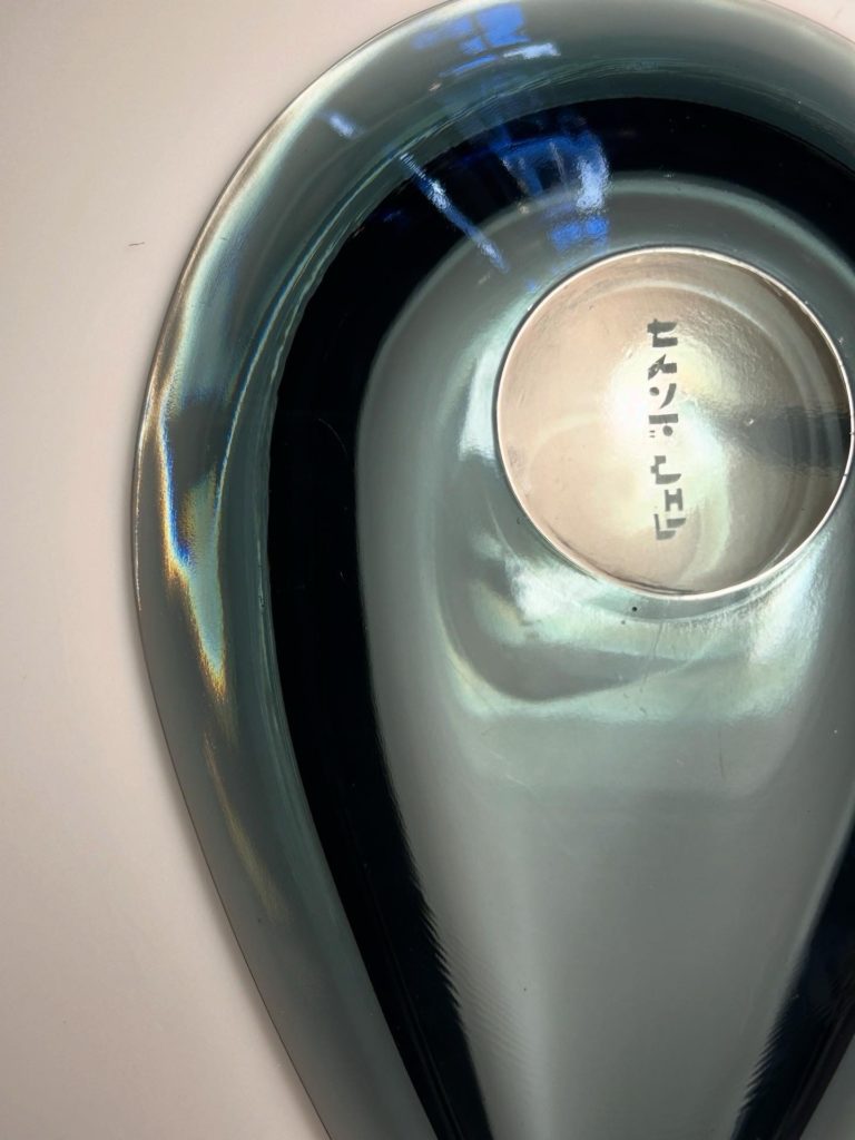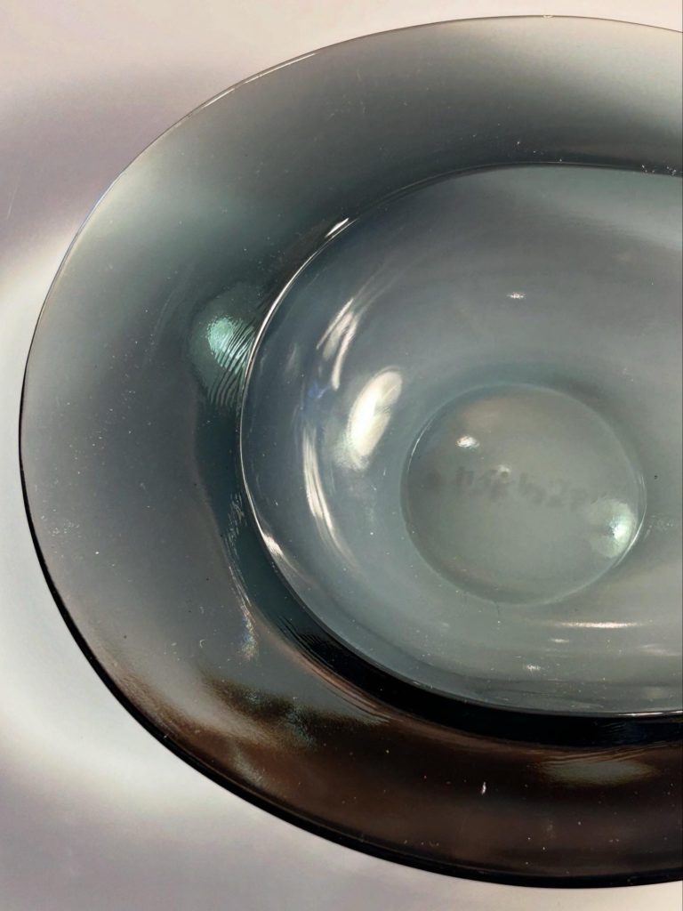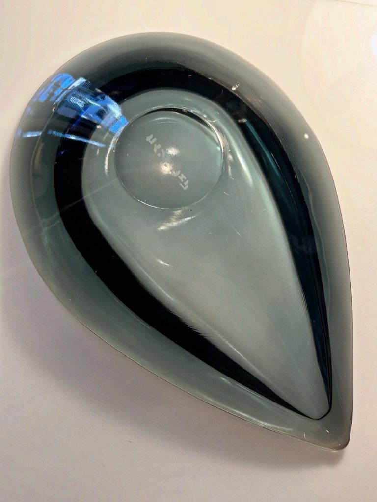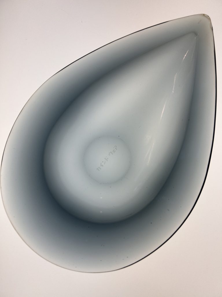 竹内伝治デザインの美麗な灰皿、70’s辺りの佐々木ガラス製。 加減によって薄緑やスモーキーなブルーグレーに見えたりする不思議な色味です。サンドブラストで カインドウェア と記念サインが入っています。撮りきれませんでしたが、上面に微かに水垢状痕が、先端左脇下へアタリ痕の軽いクラックが有ります。