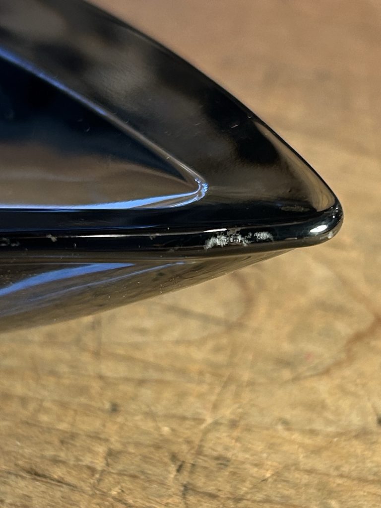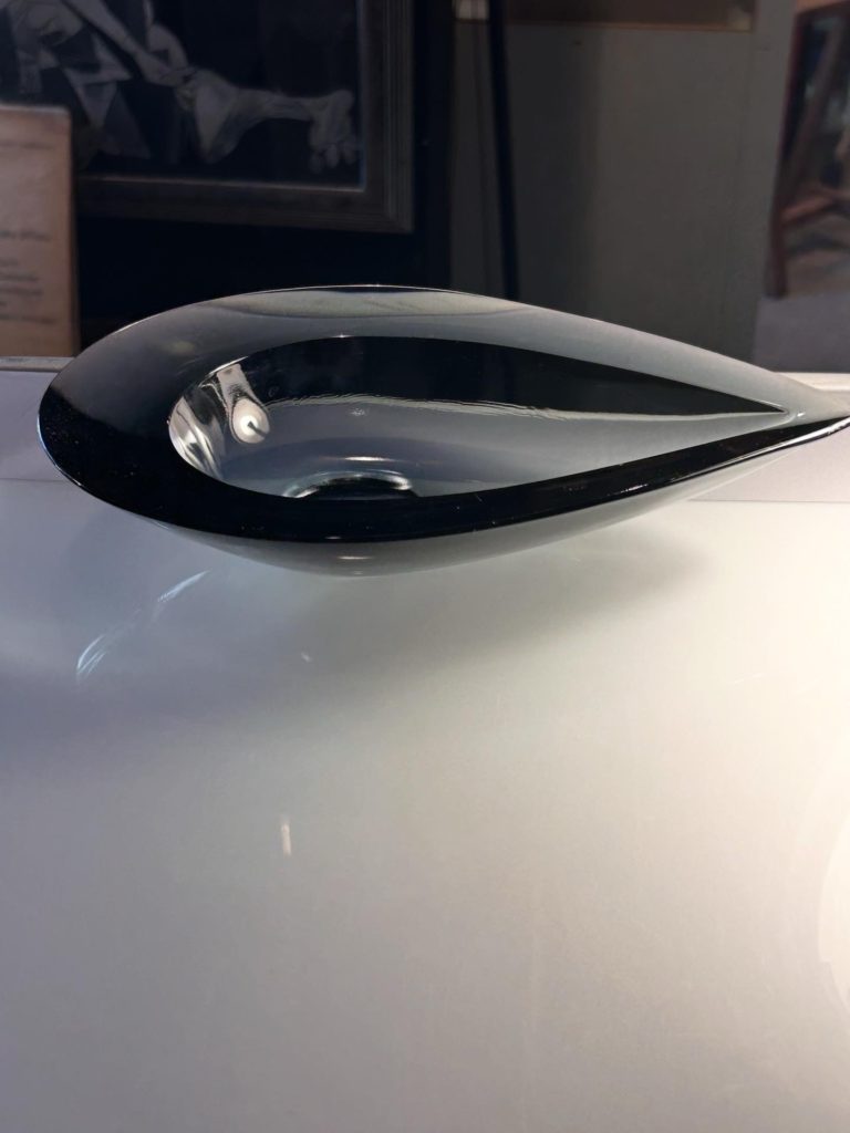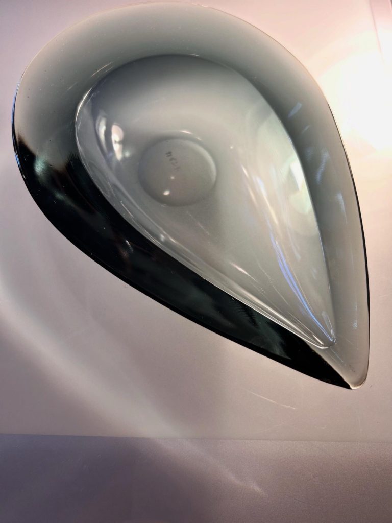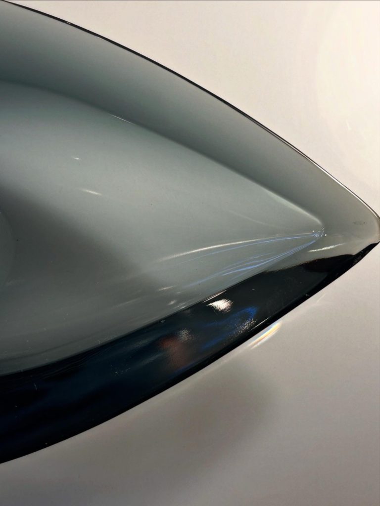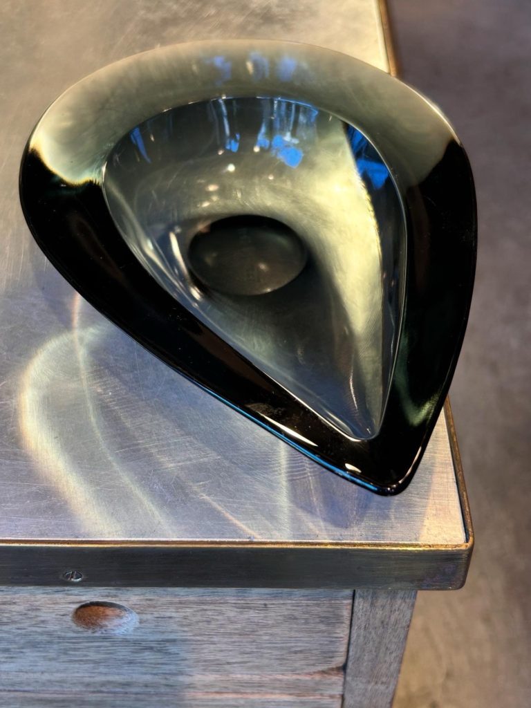 竹内伝治デザインの美麗な灰皿、70’s辺りの佐々木ガラス製。 加減によって薄緑やスモーキーなブルーグレーに見えたりする不思議な色味です。サンドブラストで カインドウェア と記念サインが入っています。撮りきれませんでしたが、上面に微かに水垢状痕が、先端左脇下へアタリ痕の軽いクラックが有ります。