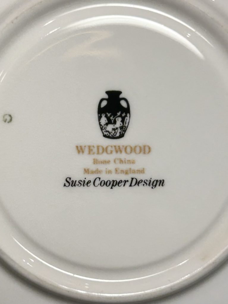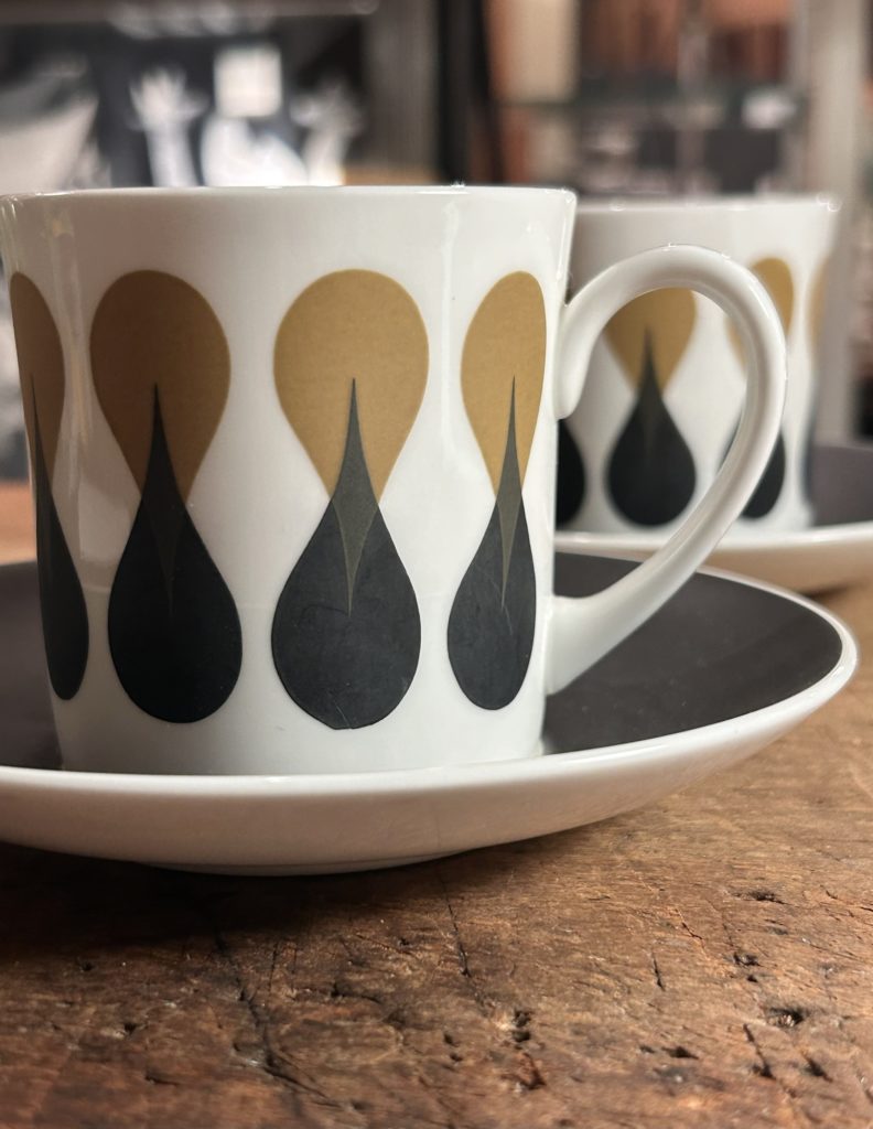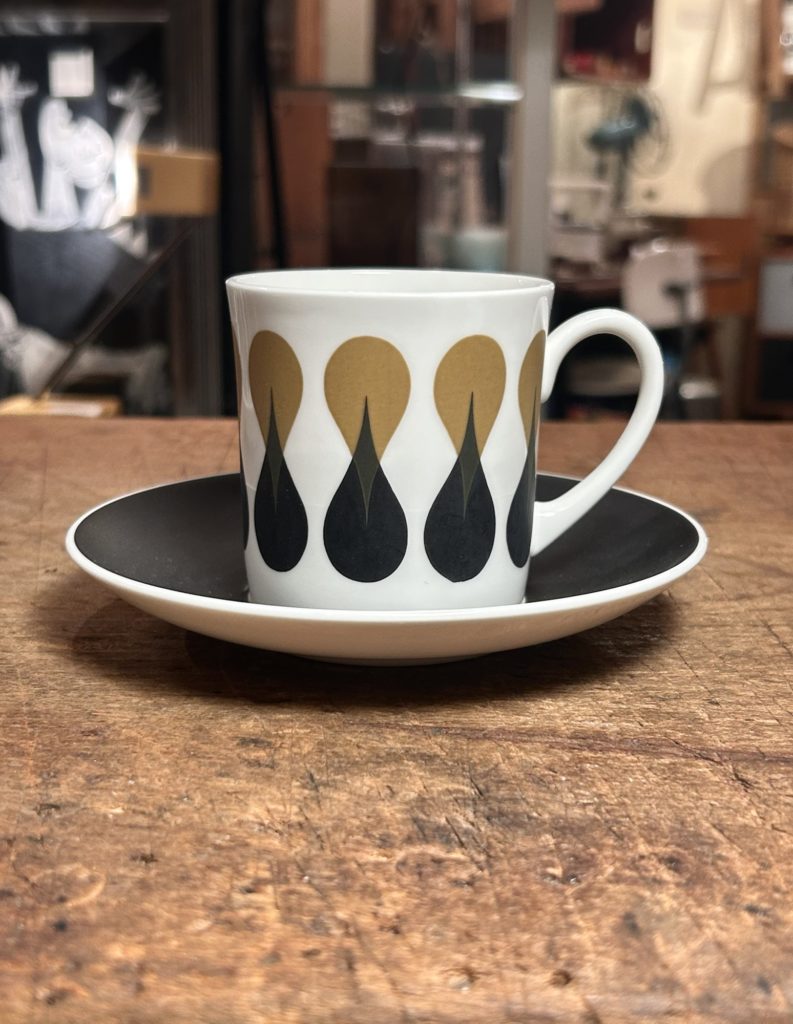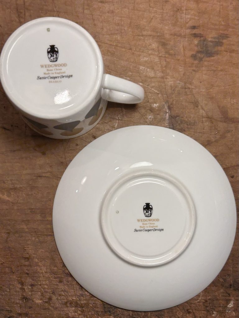 洒落たモダンデザインのC&Sが入荷しました。1969年に発表されたDIABLO / ディアブロシリーズより。スージークーパーデザイン、英国ウェッジウッド製です。磁器へマットなブラック&オーカーが非常にシックです、ブラックエリアへ光の加減で僅かに水痕的な変質が見られ無くもないですが、新品かと思うくらいな綺麗なコンディションです。