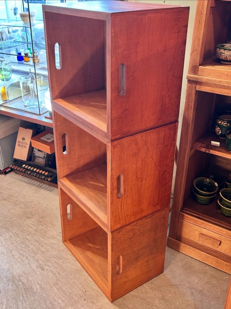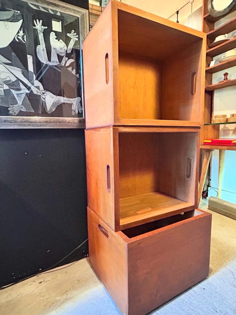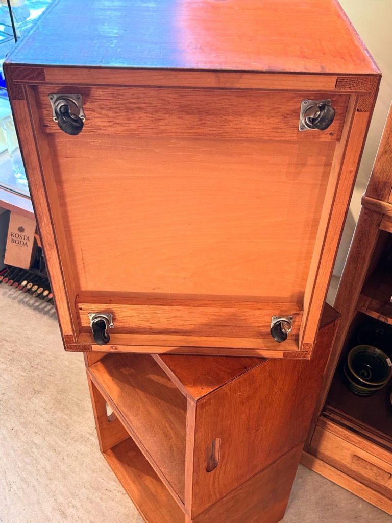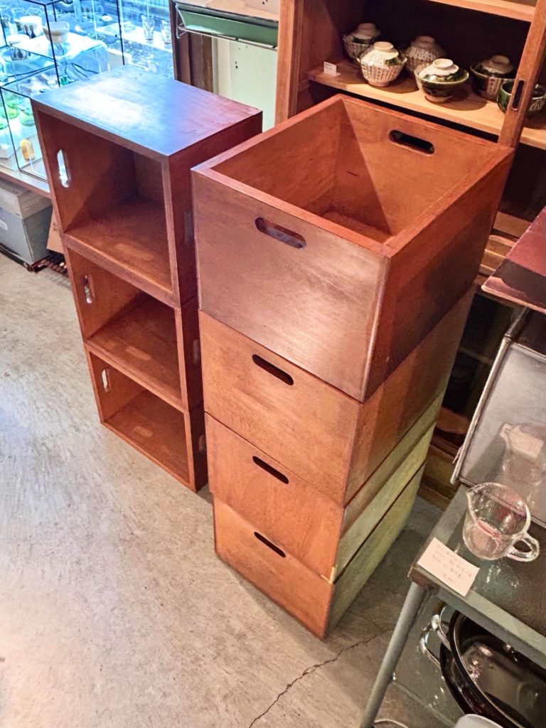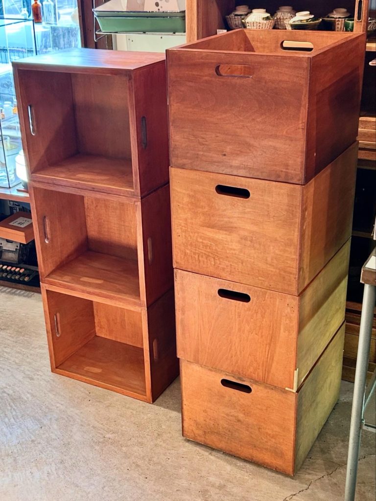 主にエッジ部、表面の突板が荒れて割れ欠けてる箇所が散見されまして、ステインの塗装が粗めだったり色味が違ったり傷などと個体差がございます。また、底部に小型キャスターを装着した物が数台ございます、外す事も可能ですし付いてない箱へ新たに着ける事も出来ます。
